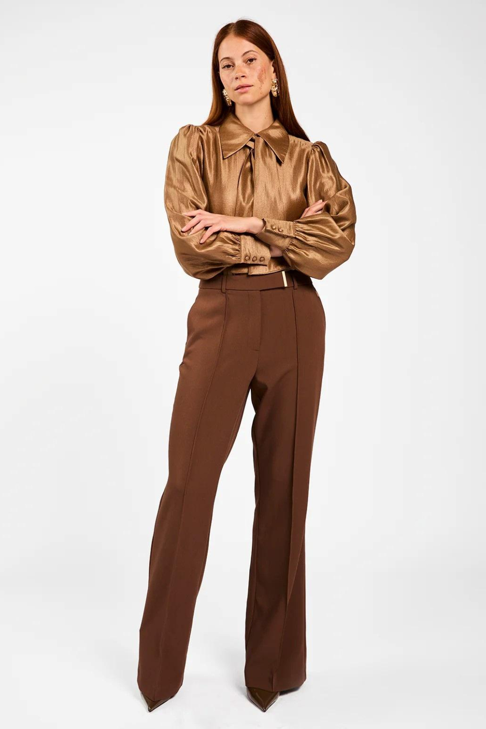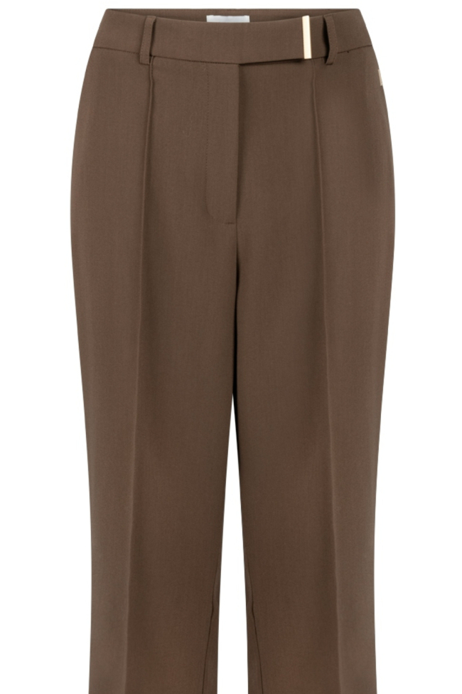 Deze stijlvolle flared broek van Aaiko is de perfecte aanvulling op je herfstgarderobe. De broek is vervaardigd uit 79% gerecycled polyester, gecombineerd met viscose en elastaan, wat zorgt voor een comfortabele, flexibele pasvorm. Met een high waist en een sluiting met knoop en rits, biedt deze broek een moderne en strak uiterlijk dat ideaal is voor casual gelegenheden. De diepe bruine kleur is veelzijdig te combineren en dankzij de steekzakken is de broek ook nog eens praktisch.