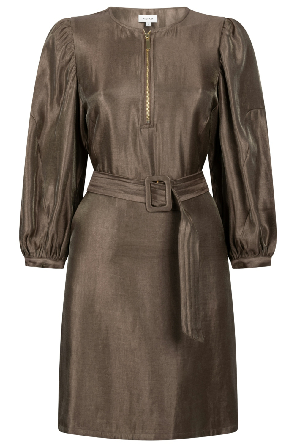 Deze chique jurk van Aaiko biedt een stijlvolle twist aan je herfstgarderobe. Het glanzende bronskleurige materiaal en de subtiele glitterdetails geven de jurk een elegante uitstraling. Met een regular pasvorm en een halflange lengte valt de jurk soepel om je lichaam, terwijl de ronde hals en de 3/4 mouwen zorgen voor een verfijnde afwerking. De ritssluiting aan de voorkant voegt een moderne touch toe en maakt het aankleden eenvoudig.