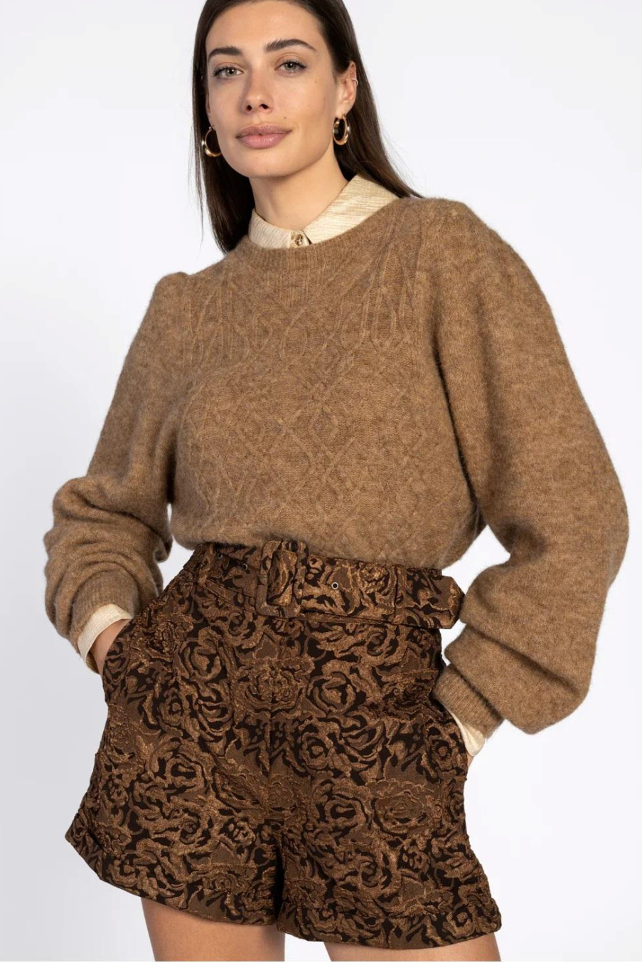 Deze chique korte broek van Aaiko combineert stijl en comfort op een verfijnde manier. Dankzij het high waist ontwerp en de regular fit is deze broek een elegante keuze voor de wintergarderobe van elke dame. De prachtige structuur van het stofpatroon in de kleur goud voegt een vleugje luxe toe aan elke outfit. Perfect afgewerkt met een knoop- en ritssluiting, deze broek weet hoe je je look moeiteloos kunt verbeteren. De steekzakken bieden praktisch nut zonder in te boeten op esthetiek.