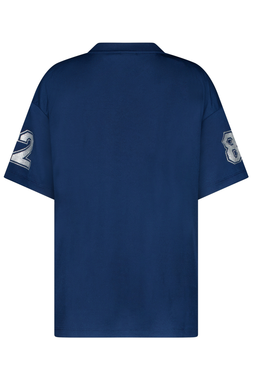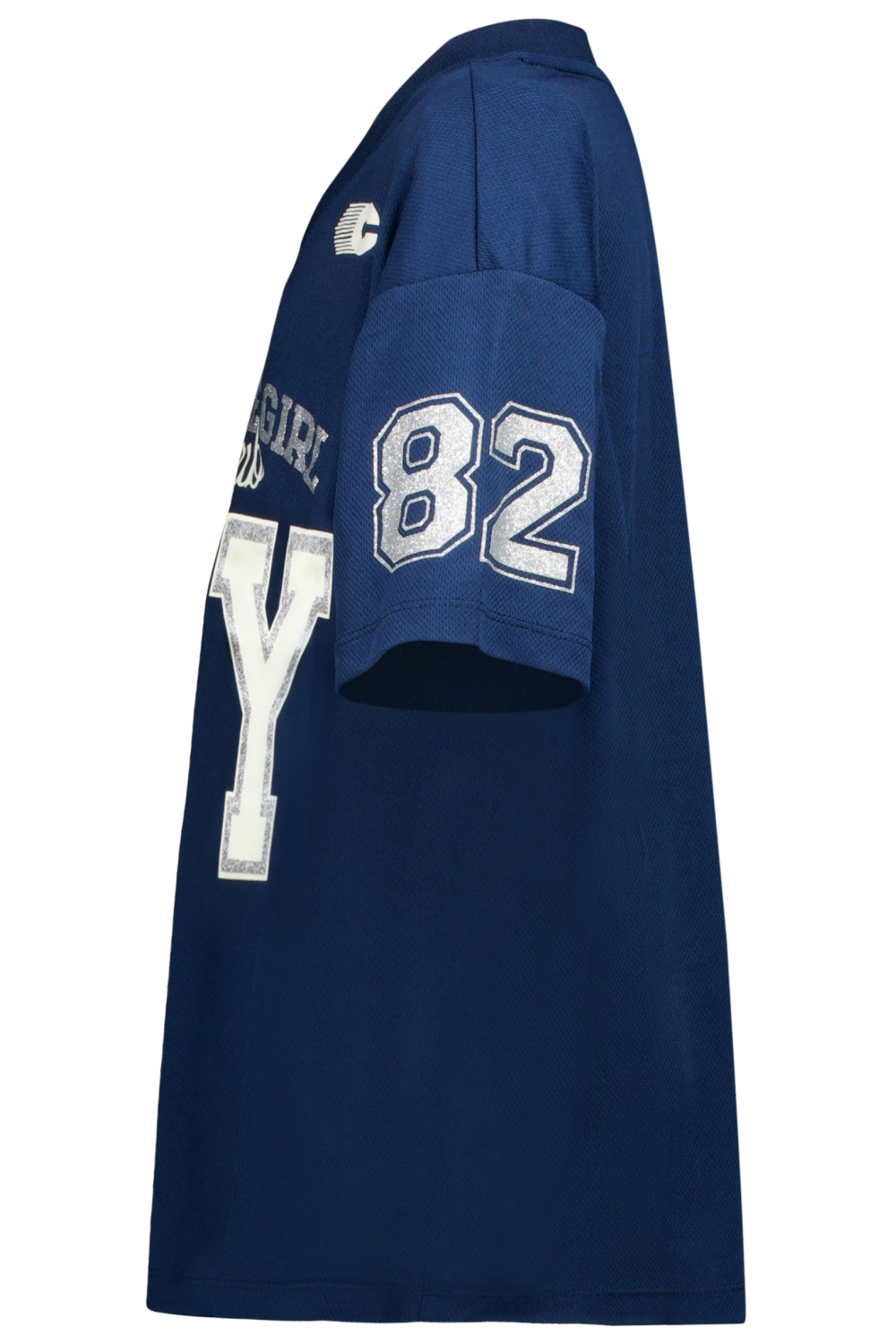 Dit opvallende navy T-shirt van het merk Cars is een perfecte keuze voor de winterse dagen. Gemaakt van 100% polyester, voelt het licht en comfortabel aan. De oversized pasvorm geeft je een ontspannen en eigentijdse look, ideaal voor casual gelegenheden. De V-hals voegt een stijlvol detail toe, terwijl de glitters op de tekst en de cijfers op de mouwen een speelse touch geven. Met zijn korte mouwen en normale lengte is dit T-shirt eenvoudig te combineren met je favoriete jeans of legging.