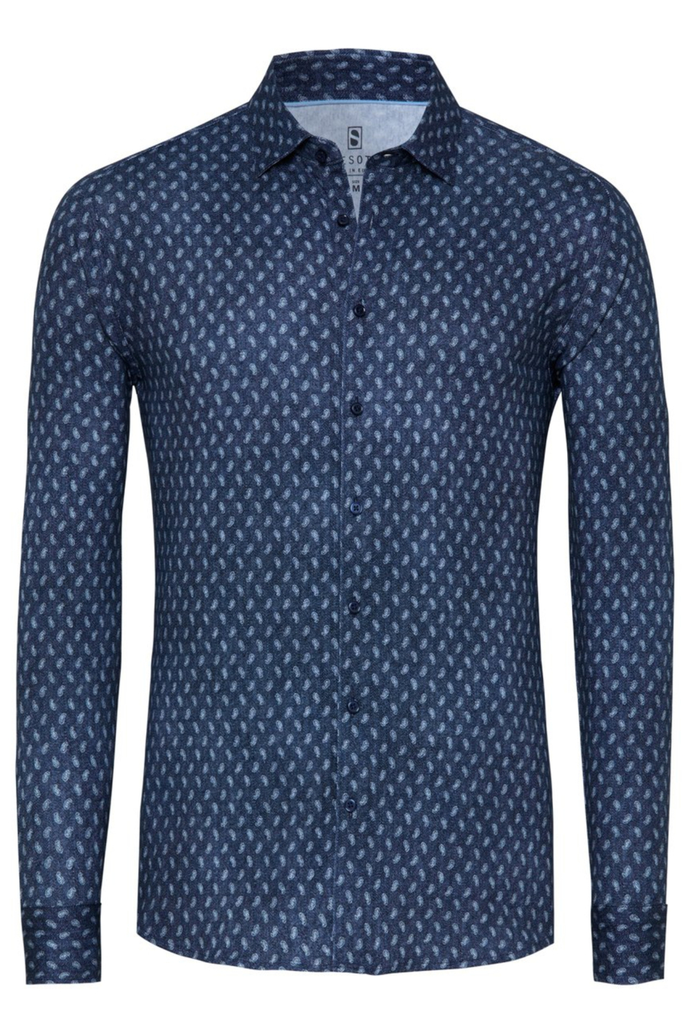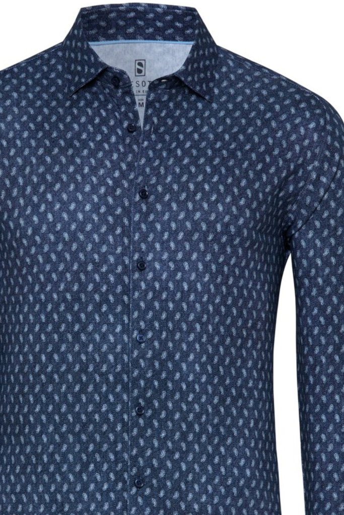 Dit casual overhemd van Desoto voegt subtiele elegantie toe aan je garderobe. Met een grafisch paisley-patroon op donkerblauw denim, biedt dit herenoverhemd een frisse en moderne uitstraling. De puntkraag en knoopsluiting maken het geschikt voor zowel informele als iets formelere gelegenheden. Dankzij de regular fit en de lange mouwen is het comfortabel te dragen gedurende de hele dag. Dit shirt, vervaardigd uit 100% katoen, voelt zacht aan op de huid en is perfect voor de herfst.