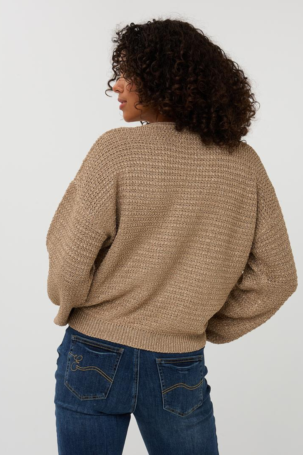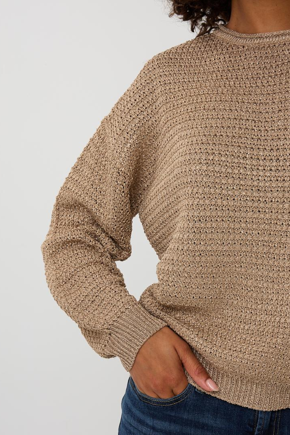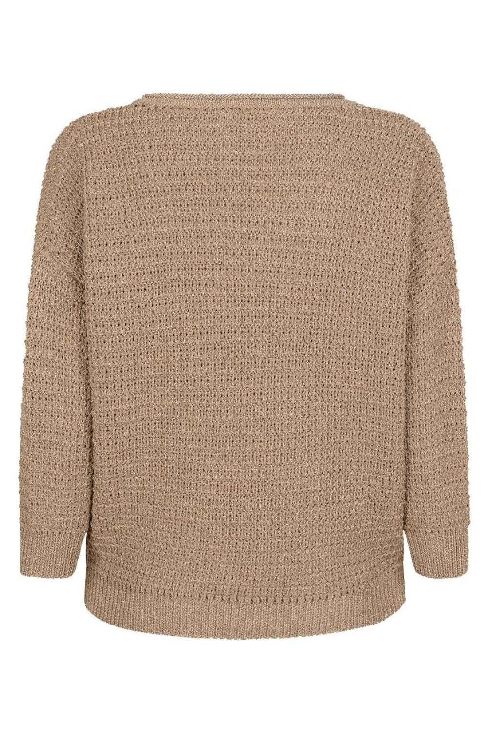 Deze elegante trui van EsQualo is een veelzijdige aanwinst voor je herfstgarderobe. Met zijn oversized pasvorm en ronde hals biedt de trui een casual maar stijlvolle uitstraling. De zandkleurige tint, voorzien van subtiele glitters, geeft een warme en sprankelende touch aan je outfit. Gemaakt met 59% viscose, 21% metaalgaren en 20% polyester, voelt de stof zacht aan op je huid en biedt het een comfortabele fit. De 7/8 mouwen maken het een ideale keuze voor de overgang tussen de seizoenen.