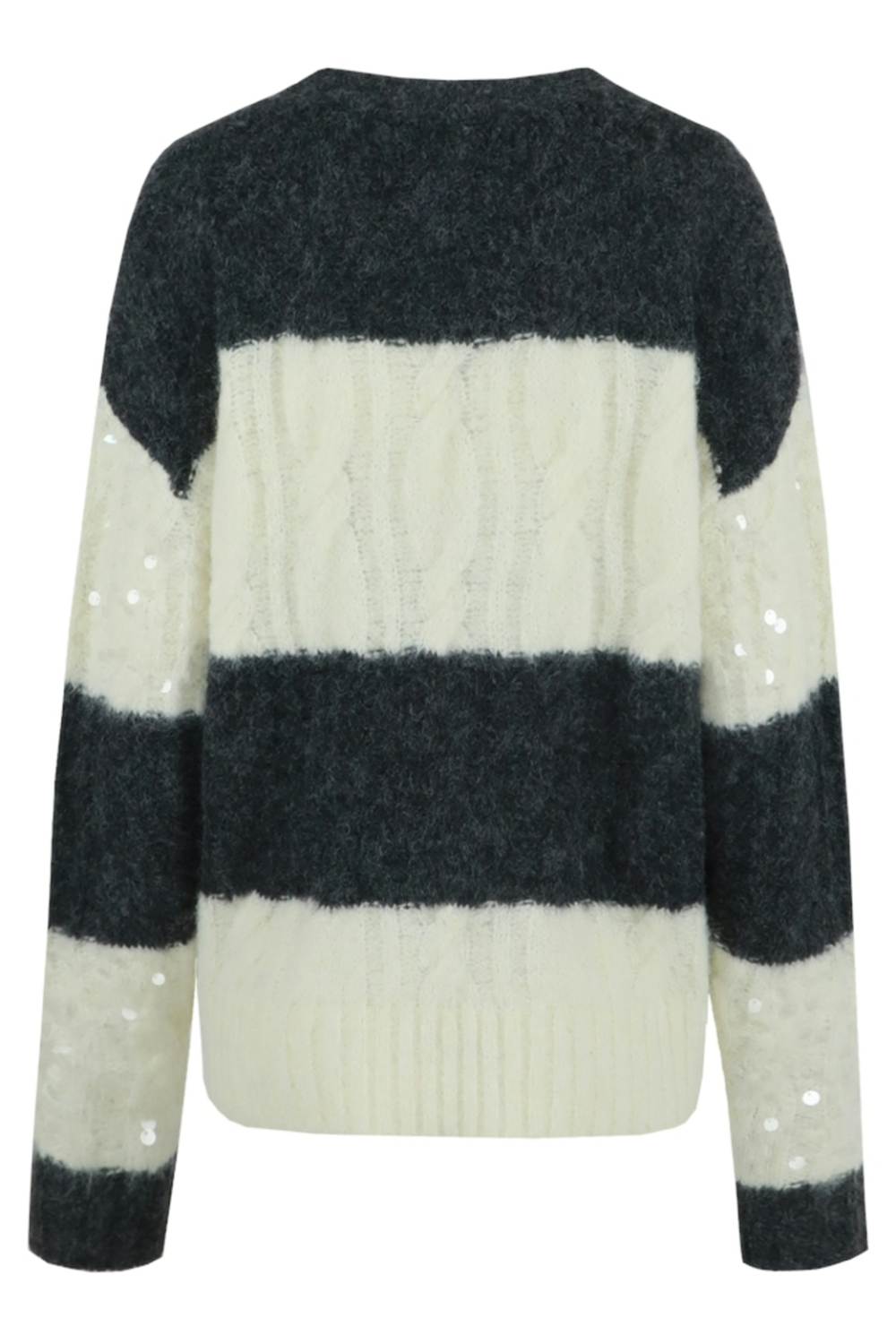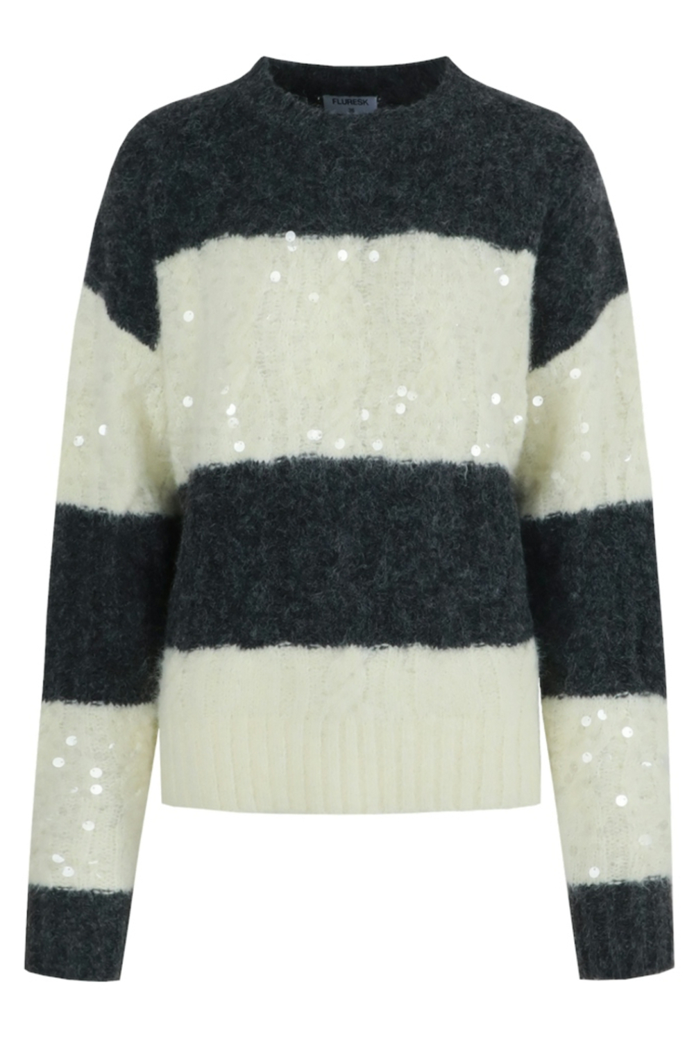 De Fluresk damestrui is een stijlvolle en comfortabele keuze voor de wintermaanden. Met een regular pasvorm en een ronde hals biedt deze trui zowel warmte als een moderne uitstraling. De combinatie van donkergrijze en crèmewitte strepen, afgewisseld met subtiele pailletten, maakt het een opvallend kledingstuk dat toch een tijdloze charme heeft. Dankzij de normale lengte en lange mouwen is deze trui perfect te dragen tijdens koudere dagen, zowel thuis als bij een informeel uitje.