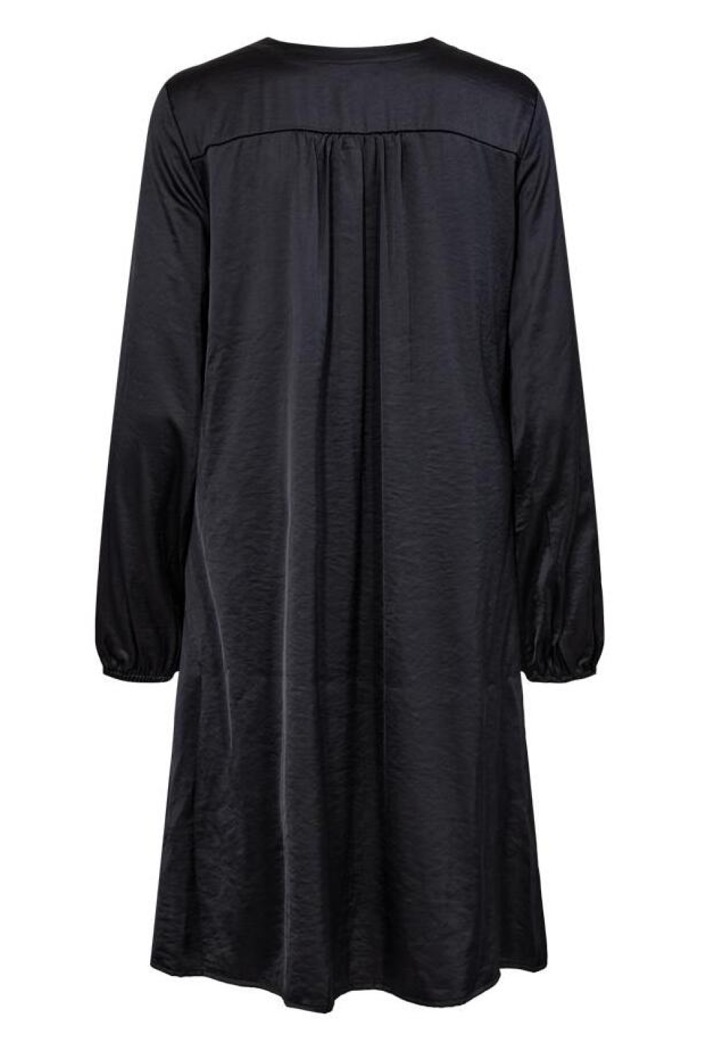 Deze zwarte jurk van Freequent is een stijlvolle en veelzijdige toevoeging aan jouw wintergarderobe. Gemaakt van een mix van 54% polyester en 46% viscose, biedt het een aangename draagervaring zonder in te boeten op stijl. De jurk heeft een regular fit waardoor hij comfortabel aanvoelt, maar tegelijkertijd zorgt de V-hals en de knoopsluiting voor een verfijnde uitstraling. De subtiele glans van de stof en de strikdetail aan de voorkant geven de jurk een elegante touch.