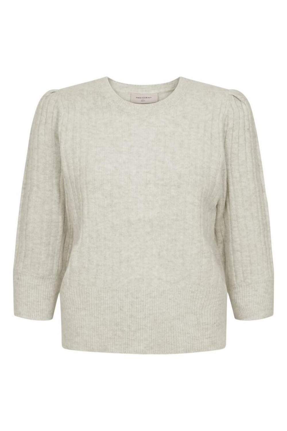 De Freequent trui in de kleur MOONBEAM MELANGE biedt de perfecte mix van stijl en comfort voor dames. Met een tijdloze ribstructuur en een regular pasvorm, past deze knitwear uitstekend in jouw wintergarderobe. De ronde hals voegt een klassieke touch toe, terwijl de subtiele pofmouwen met 3/4 lengte zorgen voor een elegante uitstraling. De zachte, gemêleerde tint maakt deze trui veelzijdig en gemakkelijk te combineren met diverse outfits, ideaal voor zowel casual als meer formele gelegenheden.