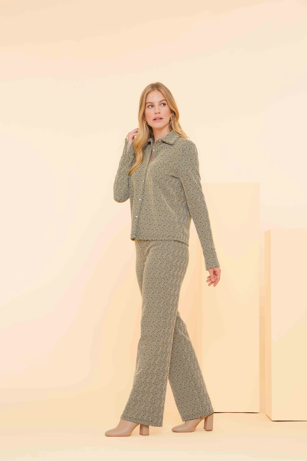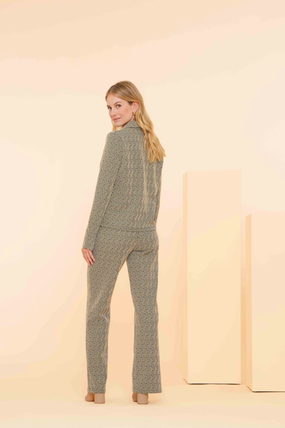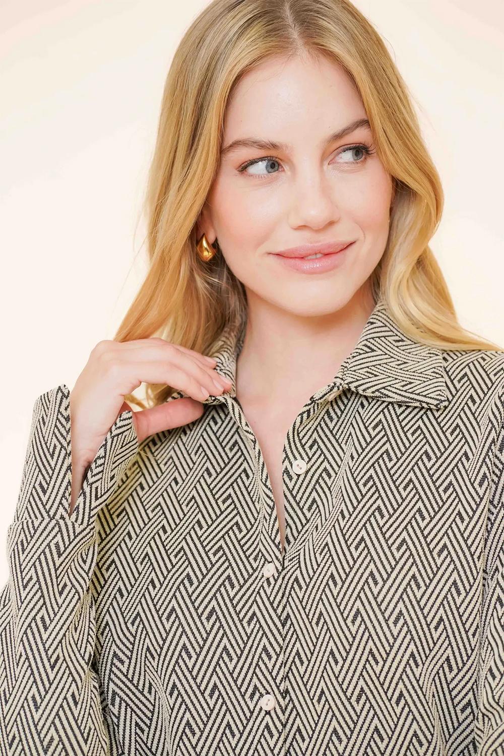 Blouse van Geisha met lange mouwen. Dit model heeft een puntkraag en sluit met een rij knopen. De blouse heeft een grafische print met een subtiele glitter.