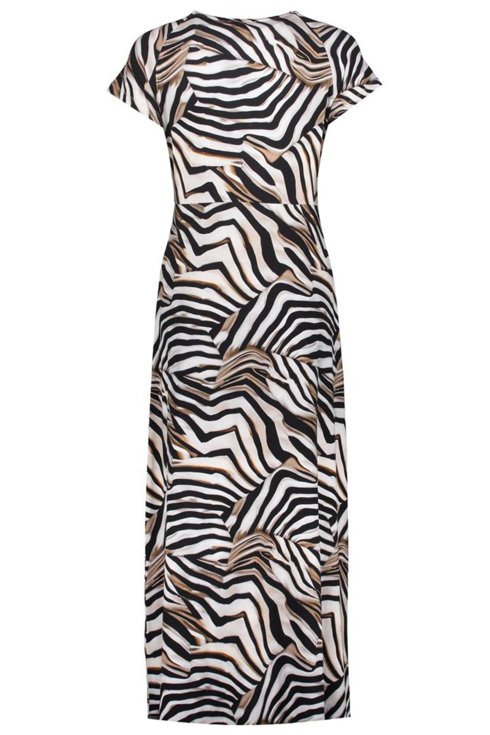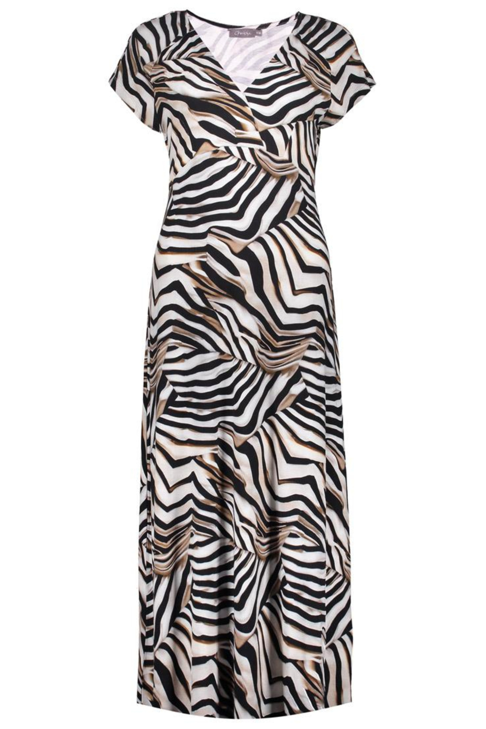 Deze elegante jurk van Geisha combineert stijl met comfort en is de perfecte keuze voor de zomerse dagen. Met een opvallende animal print in off-white en zwart trekt deze jurk op subtiele wijze de aandacht. De V-hals en de korte mouwen maken de jurk licht en luchtig, ideaal voor een casual dagje uit. De 7/8 lengte biedt een speelse draai aan de klassieke pasvorm, terwijl de mix van viscose en elastan zorgt voor lichte stretch en aangename bewegingsvrijheid. Deze Geisha jurk is veelzijdig te combineren voor verschillende gelegenheden. Draag hem met sandalen voor een ontspannen zomerse look, of combineer met hakken en subtiele accessoires voor een avondje uit. Door zijn regular fit pasvorm voelt deze jurk comfortabel aan tijdens elke activiteit. Of je nu een wandeling door de stad maakt of geniet van een dagje strand, deze jurk biedt een stijlvolle en moeiteloze uitstraling die bij elke zomerse gelegenheid past. Meer informatie: De totale lengte is 124 cm bij maat S/36.