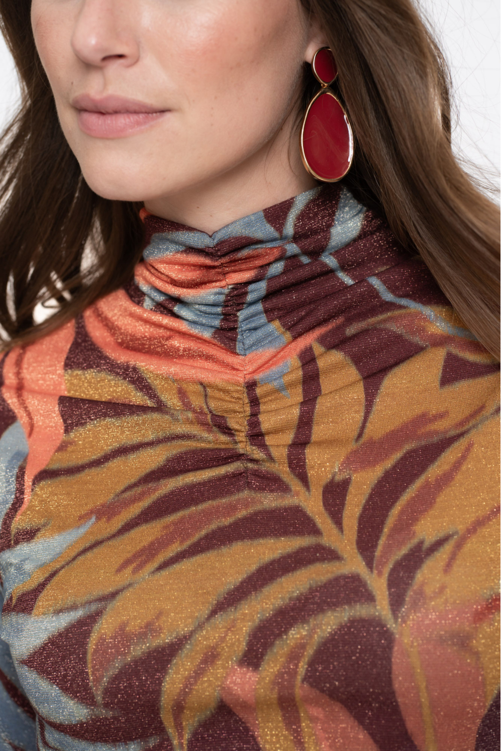 Dit kleurrijke T-shirt van Geisha is een opvallende toevoeging aan je wintergarderobe. Het ontwerp met glitters en een prachtig all-over bladerpatroon maakt het een echte blikvanger. De high neck en de lange mouwen zorgen voor extra warmte tijdens koudere dagen, terwijl de regular fit een comfortabele pasvorm biedt. Deze stijlvolle top is perfect voor casual gelegenheden en voegt met zijn opvallende kleuren een speelse touch toe aan elke outfit. De veelzijdigheid van dit T-shirt van Geisha komt goed tot zijn recht in verschillende settings. Draag het met een donkere jeans voor een ontspannen dagje uit of combineer het met een nette pantalon voor een chicere uitstraling. De normale lengte maakt het gemakkelijk om in diverse outfits te passen, en het materiaal voelt aangenaam op de huid. Of je nu besluit dit modieuze stuk te dragen naar een feestje of tijdens een gezellige lunchafspraak, het zorgt altijd voor een stijlvolle entree.