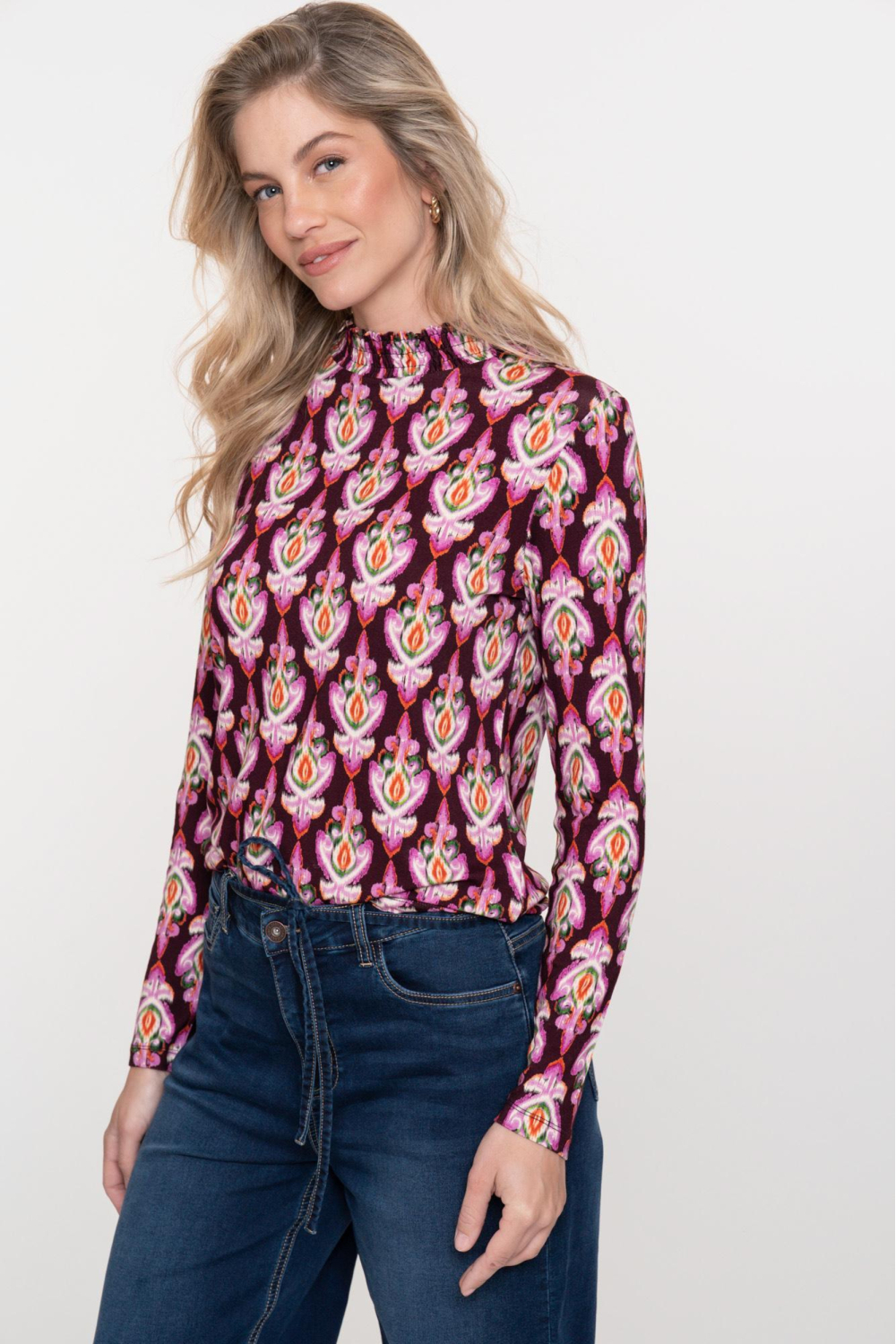 Dit grafische T-shirt van Geisha is een kleurrijke toevoeging aan je wintergarderobe. Met een speelse combinatie van roze en groene tinten weet dit shirt je outfit moeiteloos op te fleuren. De hoge hals en lange mouwen bieden warmte en comfort tijdens de koudere dagen. Gemaakt van 95% viscose en 5% elastaan, voelt het materiaal zacht aan en biedt het een aangename stretch voor de perfecte regular fit pasvorm. Dankzij het levendige patroon is dit Geisha T-shirt een uitstekende keuze voor casual gelegenheden, zoals een ontspannen lunch of een middagje winkelen. De normale lengte maakt het gemakkelijk om te combineren met jeans of een rok, voor een stijlvolle en moeiteloze look. Of je nu een statement wilt maken of gewoon iets vrolijks wilt dragen, dit T-shirt past bij elke gelegenheid en is een must voor jouw kledingkast.