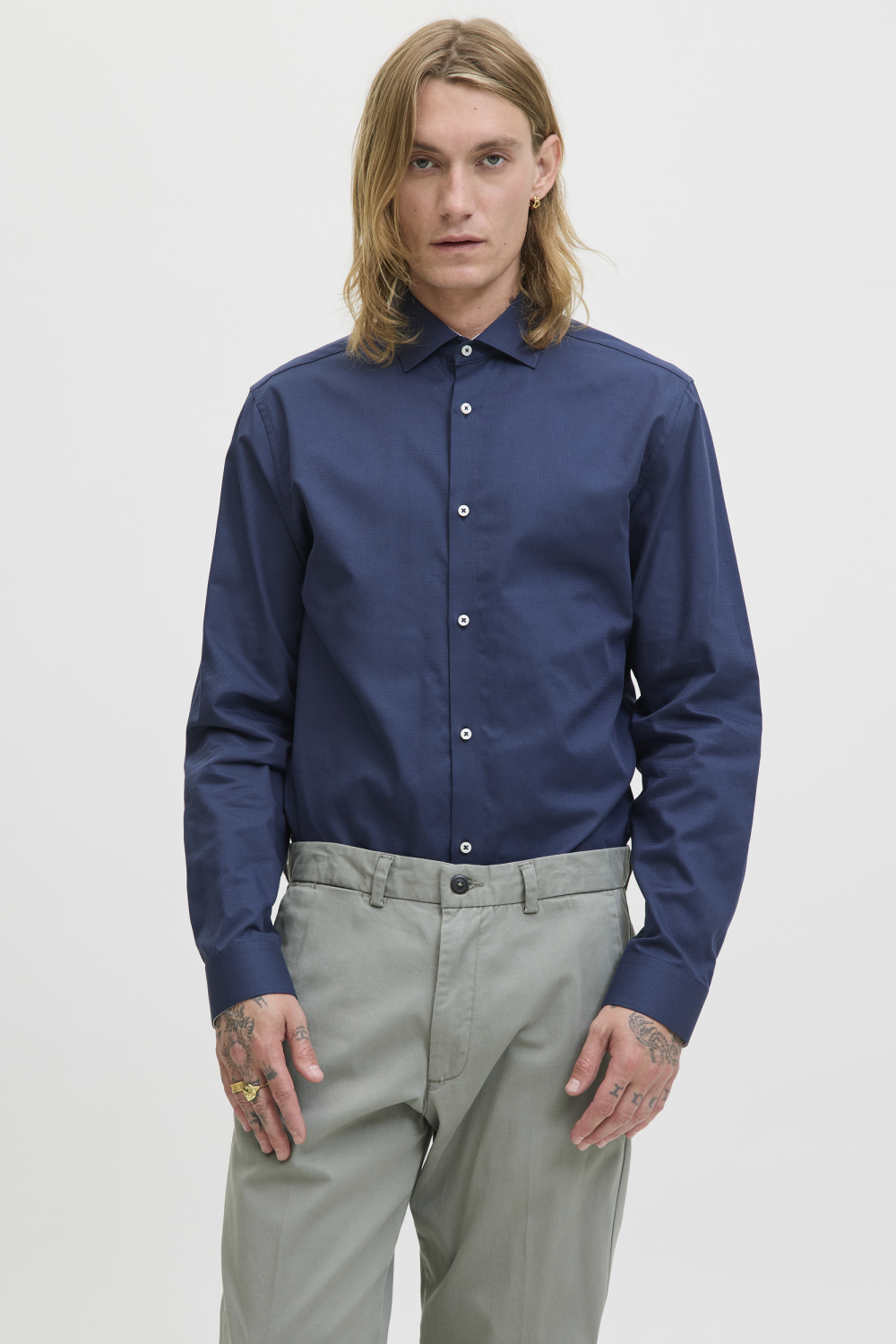 Dankzij de lange mouwen en normale lengte is dit Jack & Jones overhemd perfect voor de koudere seizoenen. De diepe navy tint zorgt ervoor dat je het gemakkelijk kunt combineren met zowel een nette pantalon als een casual jeans. Draag het tijdens een diner met vrienden of een dag op kantoor voor een moeiteloos chique look. Of je nu een belangrijke afspraak hebt of een relaxte avond plant, dit overhemd is jouw go-to kledingstuk voor elke gelegenheid.