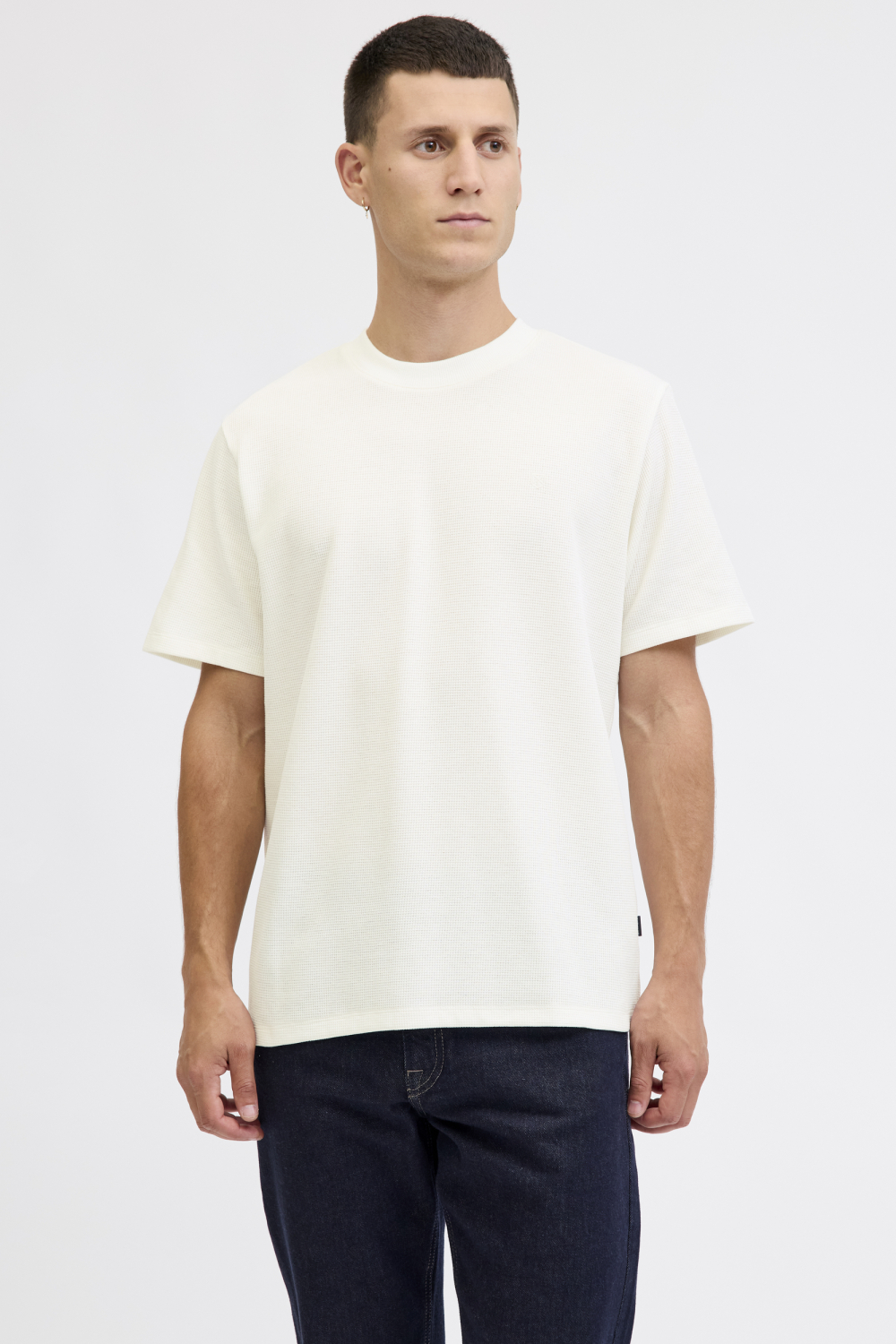 Dit regular fit T-shirt van Jack & Jones is een veelzijdige toevoeging aan je dagelijkse garderobe. Gemaakt van hoogwaardige stof in de kleur "cloud dancer", biedt het T-shirt een subtiele structuur die zorgt voor een moderne uitstraling. De ronde hals en korte mouwen maken het tot een comfortabel en stijlvol kledingstuk voor elke dag. Door zijn normale lengte is het T-shirt perfect te combineren met een jeans voor een casual look.