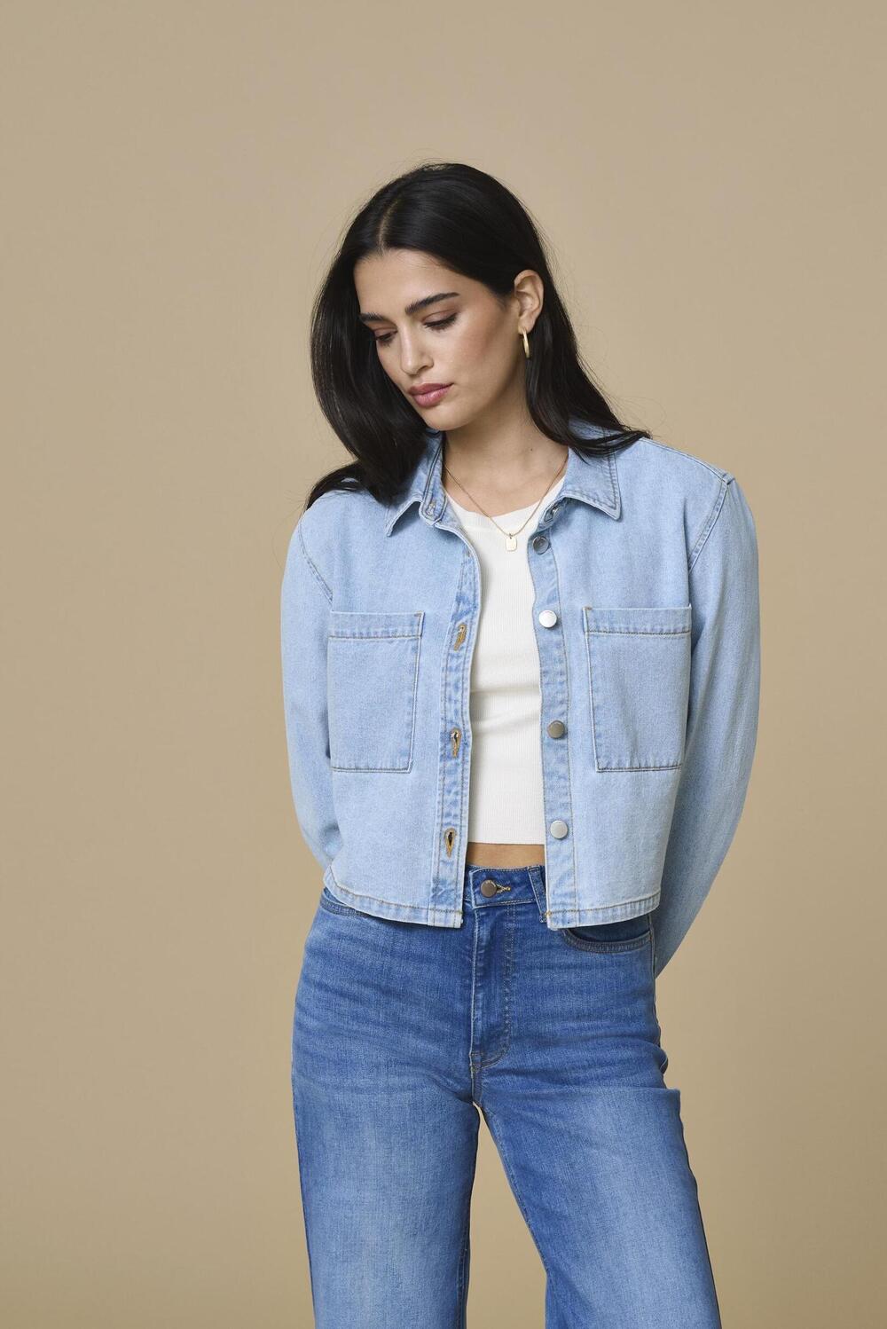 Korte spijker blouse van JDY met een bleached wassing. Dit model heeft een puntkraag en sluit met een rij knopen. De blouse heeft twee opgestikte steekzakken aan de voorkant. De totale lengte is 46 cm bij maat S.