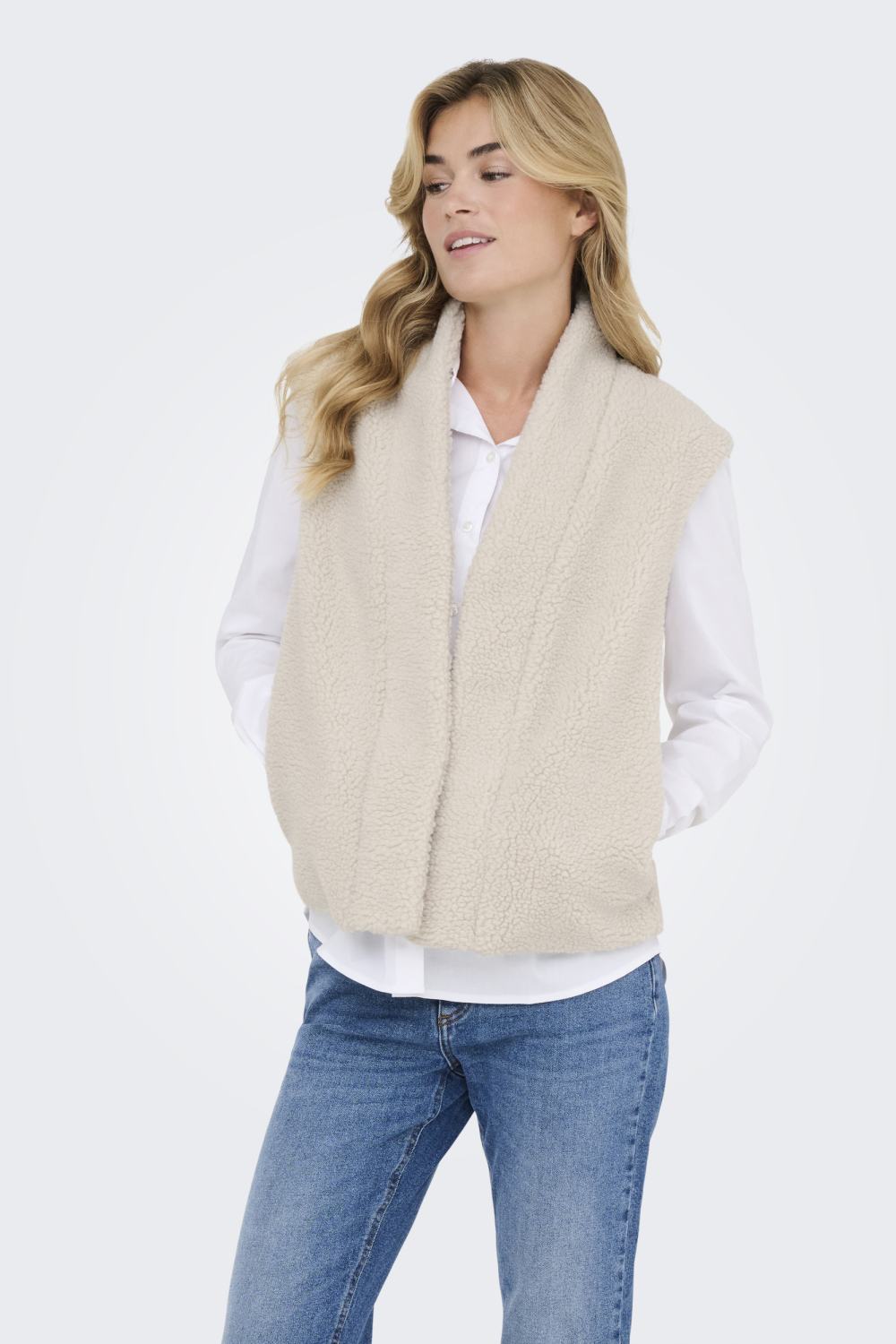 Dit gilet van Jacqueline de Yong in de kleur pumice stone is een veelzijdige aanvulling voor je garderobe. Het vest heeft een relaxed fit, ideaal voor een comfortabele en modieuze uitstraling. Gemaakt van 100% polyester geeft de teddy stof een zachte, luchtige look die geschikt is voor elk seizoen. Het mouwloze ontwerp en de normale lengte maken het een perfecte keuze voor zowel casual als iets formelere gelegenheden. De unieke teddy textuur van het gilet voegt een speels element toe aan elke outfit. Combineer het met een effen overhemd en jeans, zoals afgebeeld, voor een stijlvolle, laid-back look. Of draag het over een blouse om een warme, gelaagde outfit te creëren voor de koudere dagen. Dit Jacqueline de Yong gilet is een uitstekende match voor informele bijeenkomsten of gewoon een gezellige dag thuis.