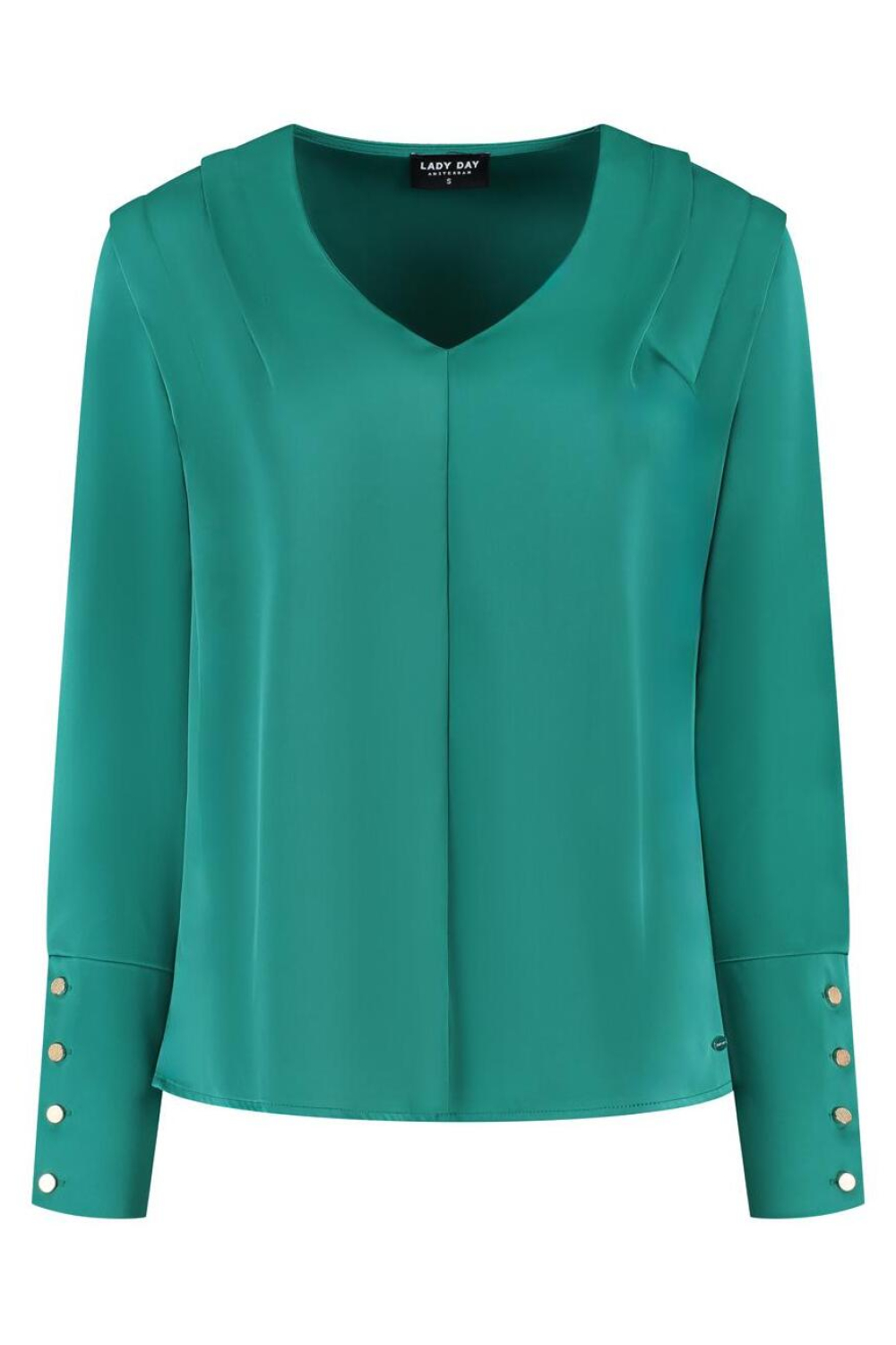 Deze elegante damesblouse van Lady Day is een stijlvolle toevoeging aan je wintergarderobe. De blouse heeft een opvallende smaragdgroene kleur die je een frisse en verfijnde uitstraling geeft. Dankzij de regular fit is er ruim voldoende bewegingsvrijheid en comfort. De V-hals maakt het geheel extra vrouwelijk en de lange mouwen zijn afgewerkt met subtiele gouden knoopdetails die een chique touch toevoegen. Vervaardigd van 100% polyester, biedt de blouse duurzaamheid zonder in te boeten op stijl.