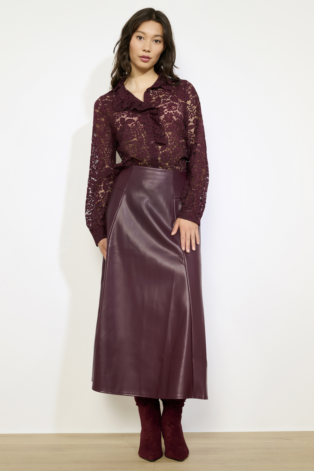 Deze stijlvolle lange rok van LolaLiza is een ideale keuze voor de winter. Gemaakt van een mix van 50% polyester en 50% polyurethaan, biedt de rok niet alleen een moderne uitstraling maar ook draagcomfort. Het ontwerp met een elegante blinde ritssluiting zorgt voor een strakke look zonder zichtbare sluitingen. De diepe bordeauxrode kleur in een imitatieleer patroon voegt een warme, luxe touch toe aan je outfit.