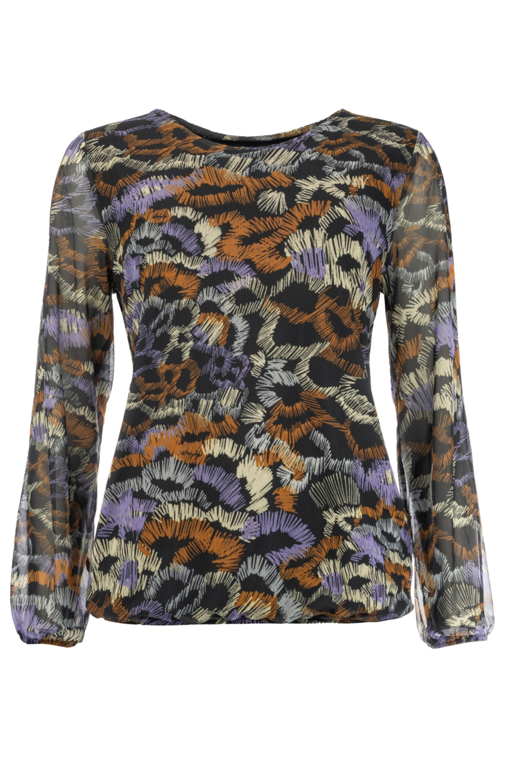 Dit dames T-shirt van NED is een elegante keuze voor de winter. Met een fraaie grafische print in rijke tinten van zwart, oranje, paars en crème, biedt het je een opvallende stijl. De ronde hals en lange mouwen maken het T-shirt veelzijdig en comfortabel. Het materiaal van 90% polyester en 10% elastan zorgt voor een lichte stretch, waardoor het prettig aanvoelt. Dankzij de regular fit en normale lengte is dit T-shirt eenvoudig te combineren met zowel jeans als een nette broek. Het is geschikt voor casual settings, maar ook prima voor een diner of informele samenkomst. De doorschijnende textuur van de stof geeft een subtiele elegantie, perfect voor een avondje uit of een ontspannen weekend. Voeg dit stijlvolle item aan je wintergarderobe toe voor een vleugje kleur en flair.