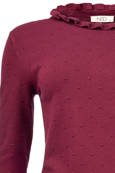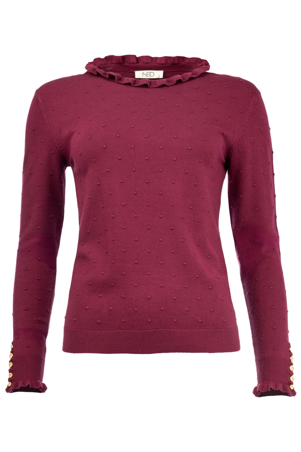 Deze stijlvolle bordeauxrode trui van NED is een must-have voor elke damesgarderobe. Met de high neck en prachtige ruches brengt deze trui een vleugje elegantie in je dagelijkse outfit. Het materiaal bestaat uit 80% viscose en 20% polyamide, waardoor de stof zacht en comfortabel aanvoelt. De subtiele stippenpatroon en de speelse ruches aan de halslijn geven deze trui een unieke look. De lange mouwen zijn afgewerkt met goudkleurige knopen, wat een chique detail toevoegt aan de casual stijl. De trui heeft een regular fit, waardoor hij perfect is voor verschillende gelegenheden. Draag hem tijdens een ontspannen weekendje weg of combineer hem met een nette rok voor een meer geklede uitstraling. Deze veelzijdige trui past goed in zowel een zakelijke omgeving als een casual setting. Vanwege het tijdloze design en de comfortabele pasvorm, wordt dit snel je favoriete kledingstuk voor het basis seizoen. Voeg deze NED trui toe aan je collectie voor een stijlvolle en veelzijdige outfit.
