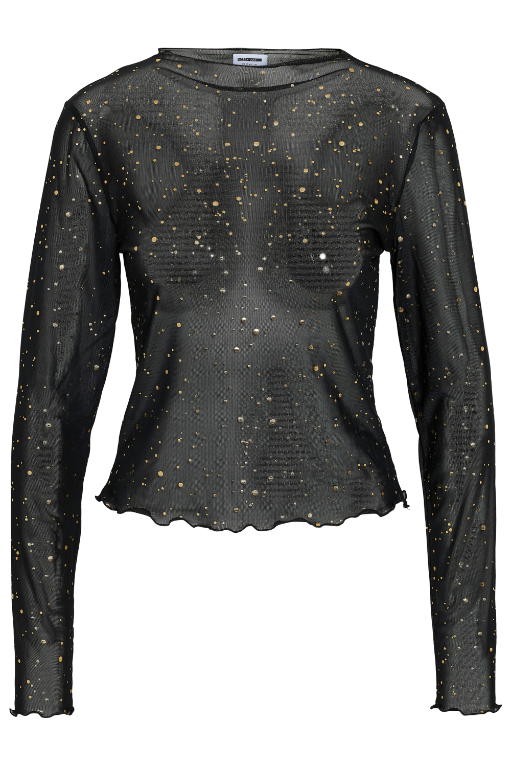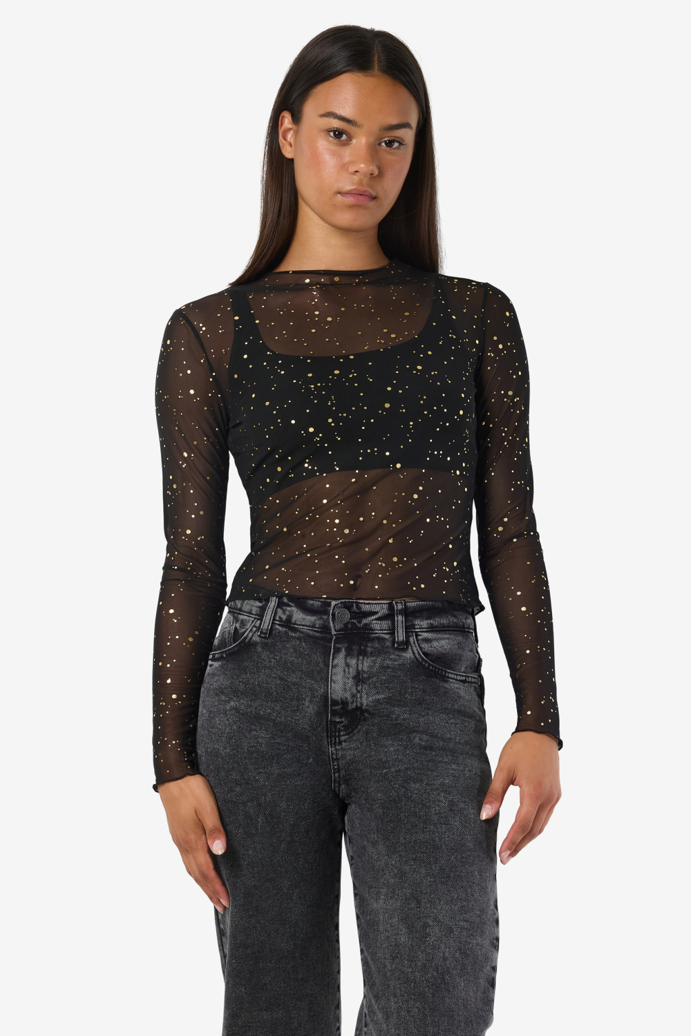 Met zijn korte lengte en subtiele, glinsterende patroon is dit shirt perfect voor avonden uit of speciale evenementen. De transparante stof voegt een speelse laag toe aan je look en kan moeiteloos worden gecombineerd met een hoge taille jeans of rok voor een modieuze touch. Of je nu de dansvloer onveilig maakt of een dinerdate hebt, met dit Noisy may T-shirt steel je zeker de show.
