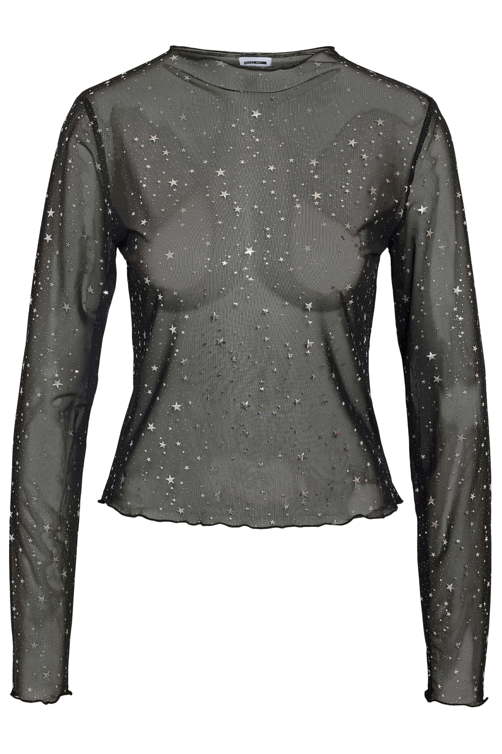 Dit speelse zwarte T-shirt met glitters van Noisy may geeft je wintergarderobe een stijlvolle upgrade. Het T-shirt is gemaakt van 94% gerecycled polyester en 6% elastan, wat zorgt voor een comfortabele slim fit en een duurzame keuze. De lange mouwen combineren moeiteloos met de normale lengte, terwijl de ronde hals een casual uitstraling biedt. Perfect voor een avondje uit of een feestelijke gelegenheid, dankzij het opvallende sterrendessin dat subtiel schittert op de doorzichtige stof.