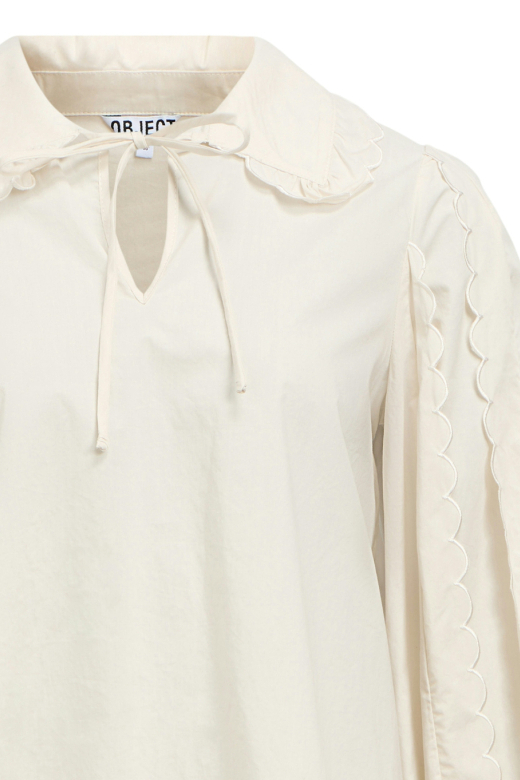 Ontdek de veelzijdigheid van deze witte sand blouse van Object, jouw nieuwe favoriete kledingstuk voor het komende herfstseizoen. Gemaakt van een duurzame mix van 50% katoen en 50% biologisch katoen, biedt deze blouse niet alleen comfort maar ook een milieuvriendelijke keuze. De regular fit pasvorm zorgt voor een ontspannen silhouette dat je de hele dag door comfortabel houdt. Met elegante ruches langs de mouwen en een subtiele V-hals met een strikkoord, voegt deze blouse een speels detail toe aan je casual outfits.