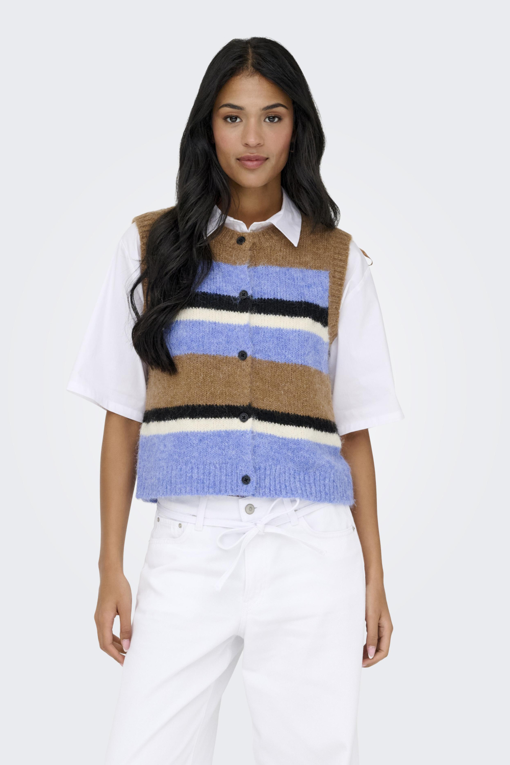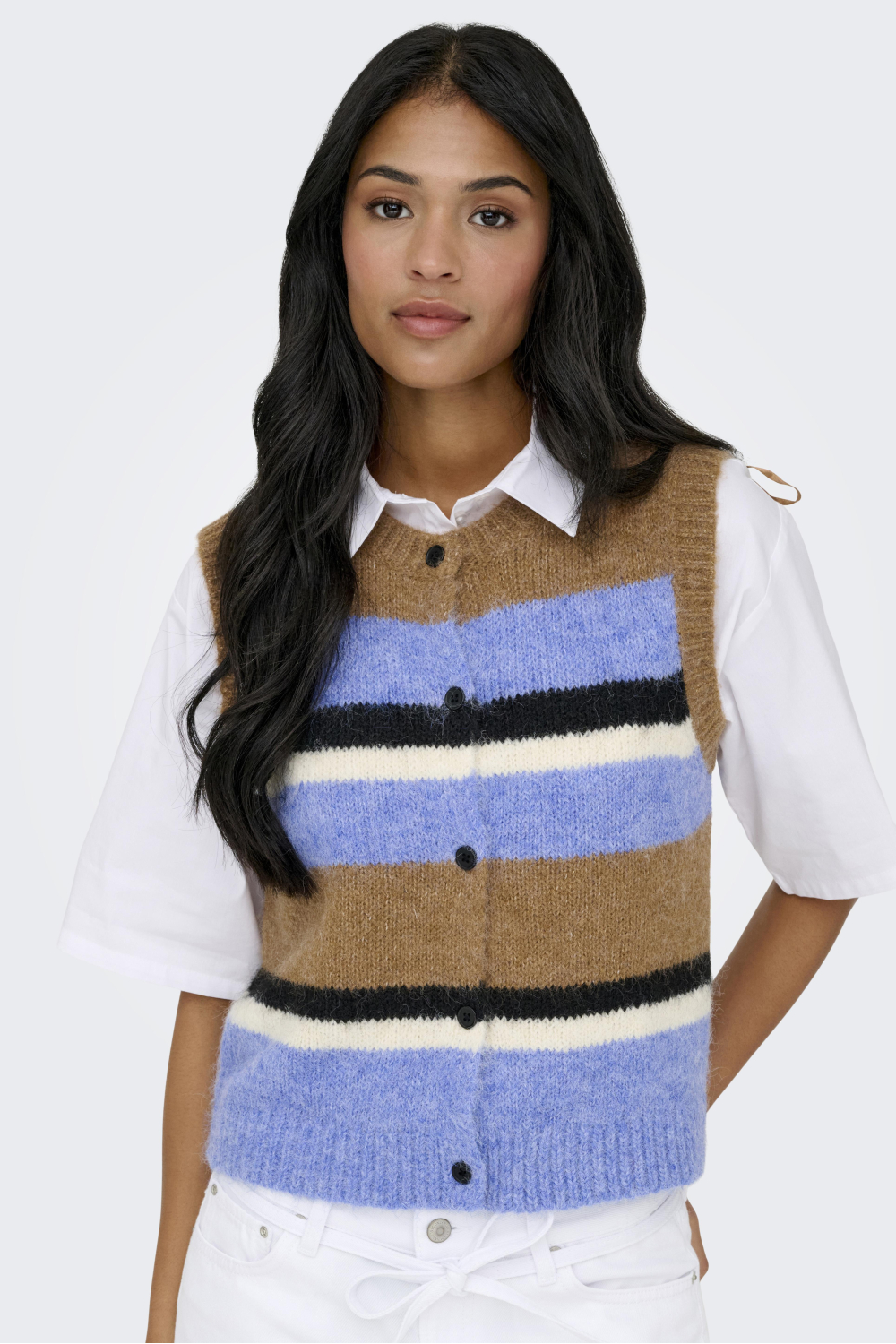Dit damesgilet van Only, uit de collectie gilets, is een stijlvolle toevoeging aan je wintergarderobe. Met een gemêleerd patroon in koele blauwe en warme bruine tinten, biedt het een frisse kijk op knitwear. De regular pasvorm maakt dit vest geschikt voor zowel casual als meer formele settings. Dankzij de knoopsluiting en de ronde hals is het makkelijk te combineren met een blouse of een simpele top voor een veelzijdige look. De mouwloze uitvoering van dit Only gilet maakt het een perfecte keuze voor lagen tijdens de koudere maanden. Combineer het met een kokerrok voor een zakelijke outfit of met een spijkerbroek voor een relaxte vrijetijdsstijl. De normale lengte zorgt ervoor dat je gemakkelijk lagen kunt toevoegen zonder in te boeten op stijl of comfort. Of je nu naar kantoor gaat of een dagje uit gepland hebt, dit gilet biedt je een modieuze en comfortabele optie die altijd goed zit.