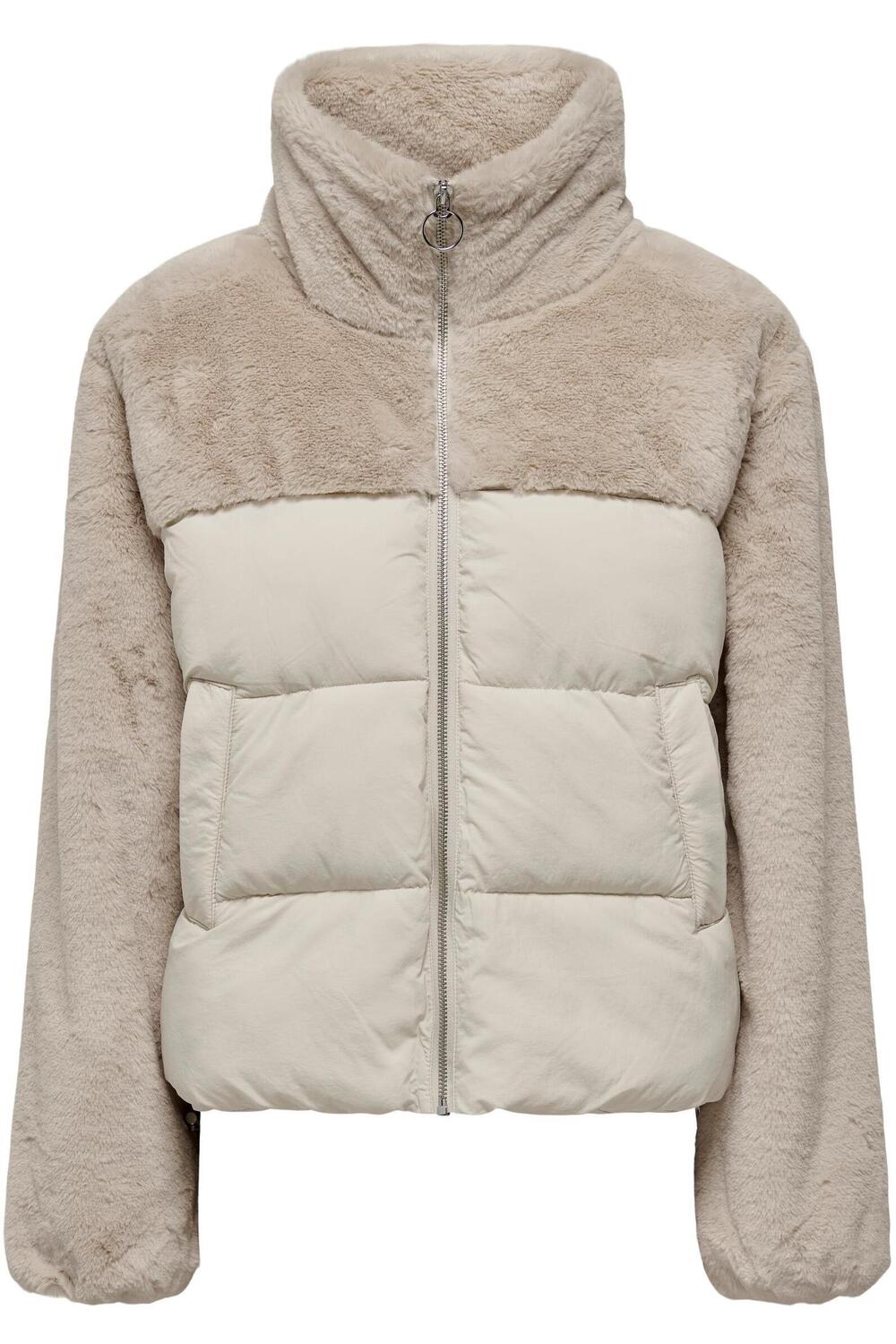Jas van Only met lange mouwen. Dit item heeft een hoge kraag en sluit met een rist. Voorop bevinden zich 2 steekzakken. Aan de onderkant zit elastiek waarmee je de jas kan verstellen.
