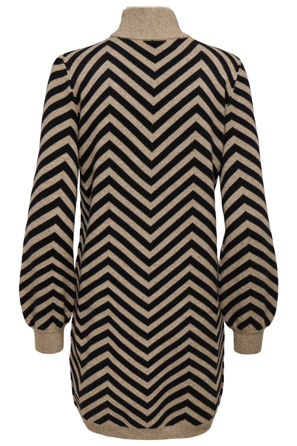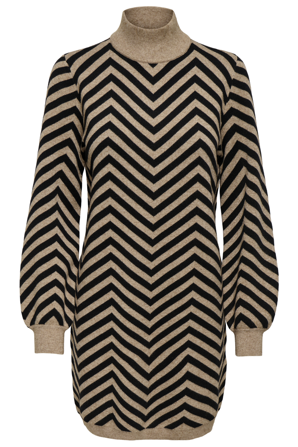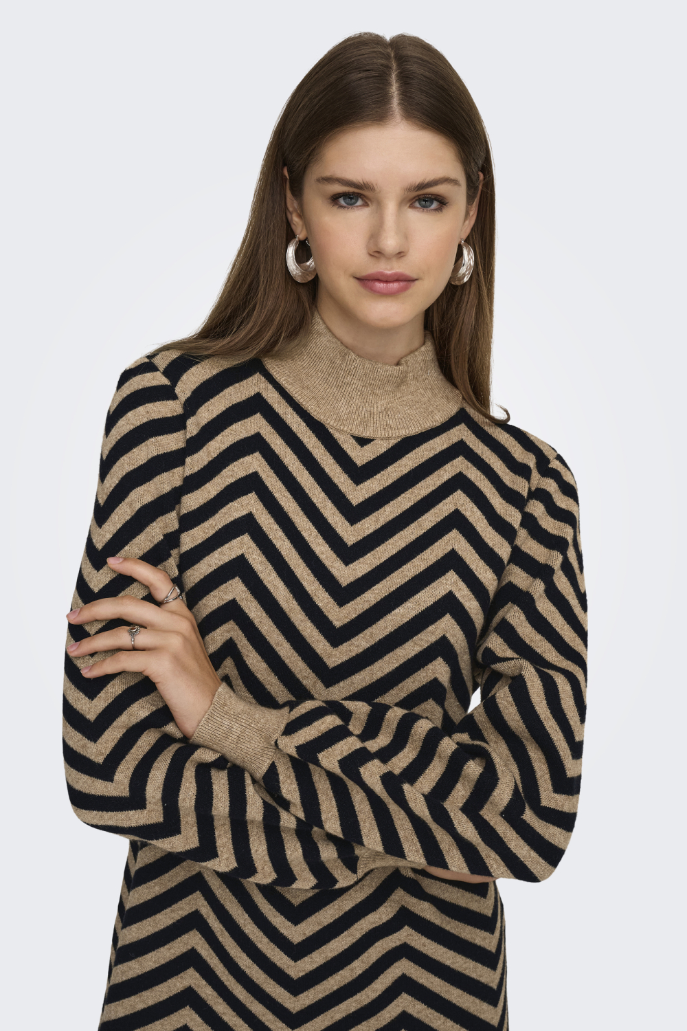Deze stijlvolle jurk van Only is een knusse toevoeging aan je wintergarderobe. Met zijn zigzagpatroon in de kleuren Toasted Coconut en zwart, biedt deze knitwear jurk een unieke uitstraling die je look direct een upgrade geeft. De regular pasvorm zorgt voor comfort, terwijl de hoge hals extra warmte biedt op koude dagen. De lange mouwen in combinatie met de korte lengte maken het een veelzijdige keuze voor verschillende gelegenheden.