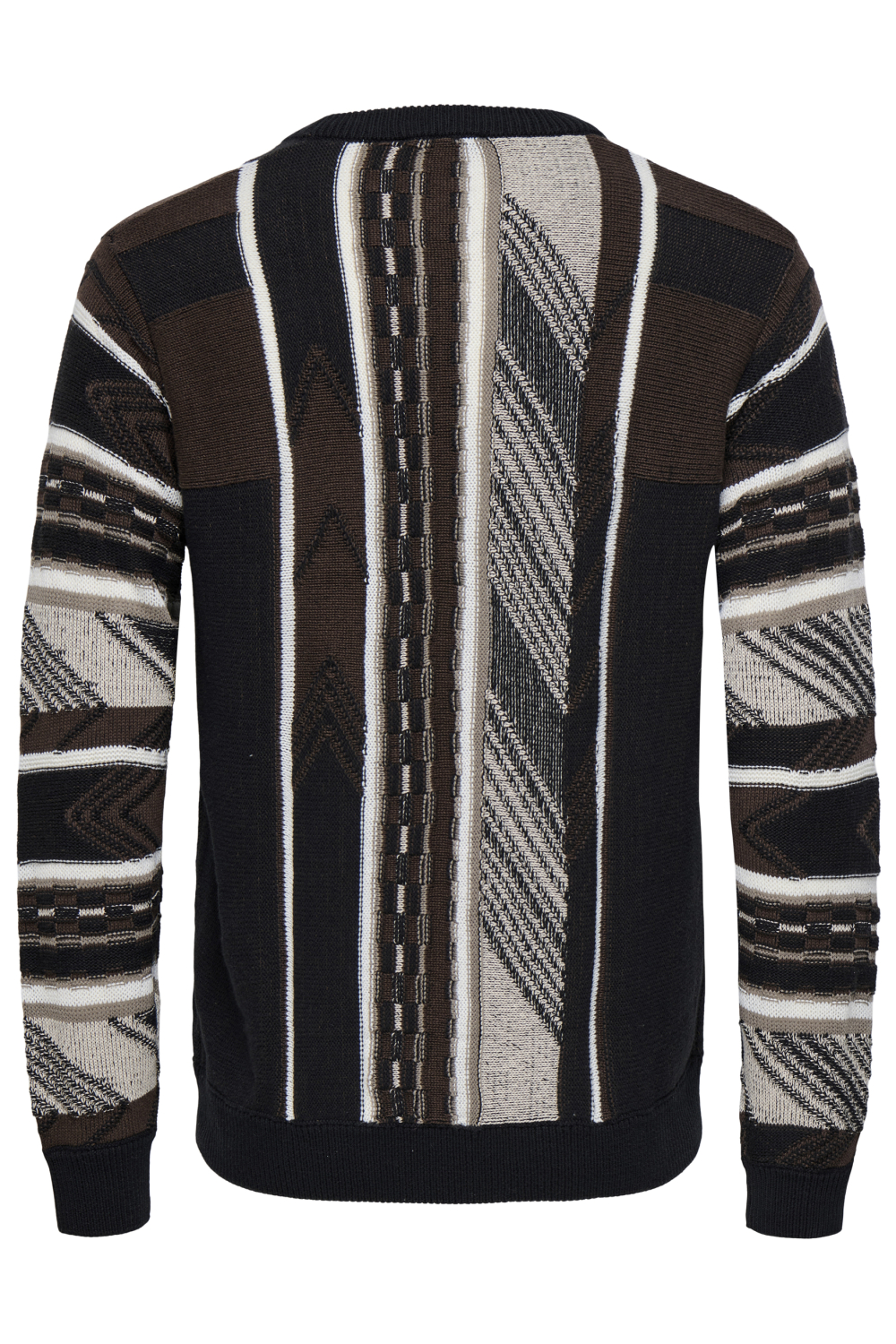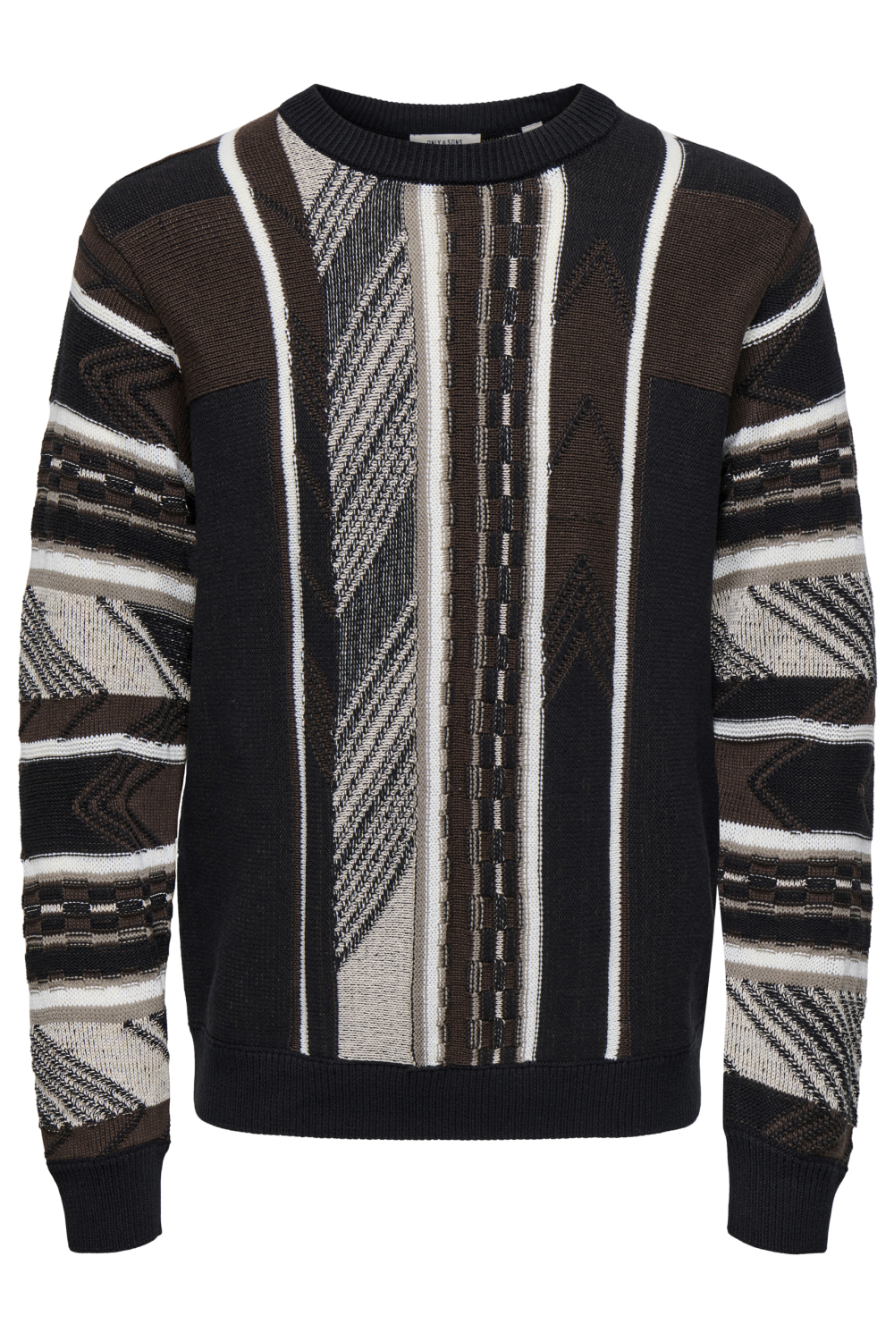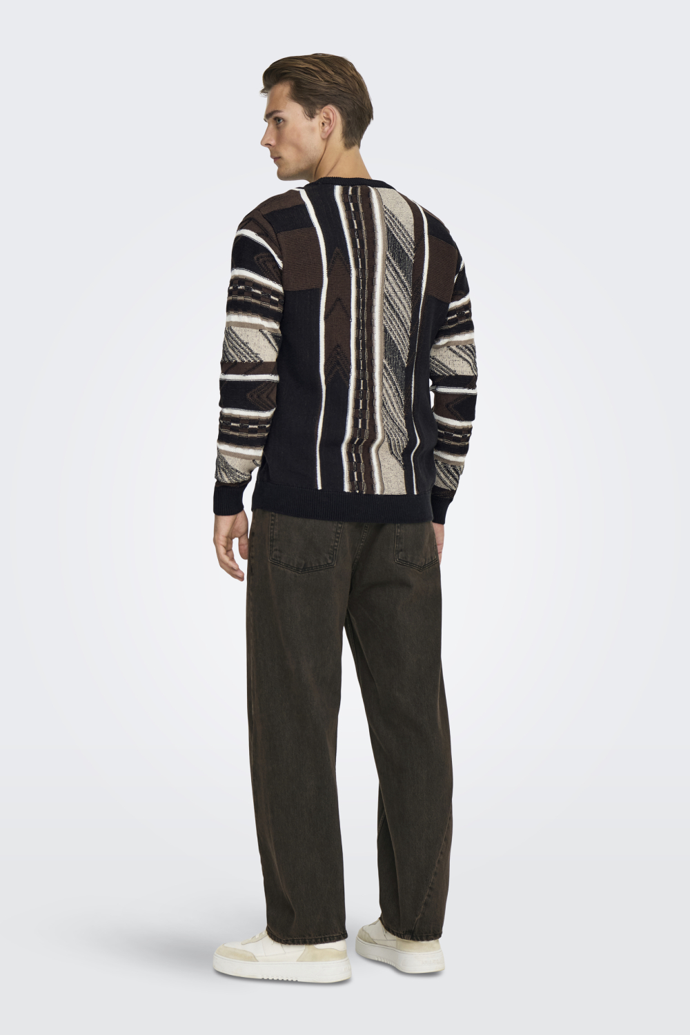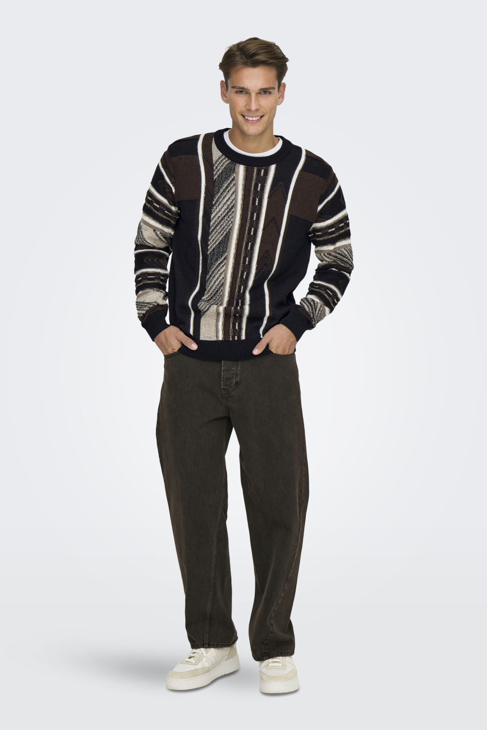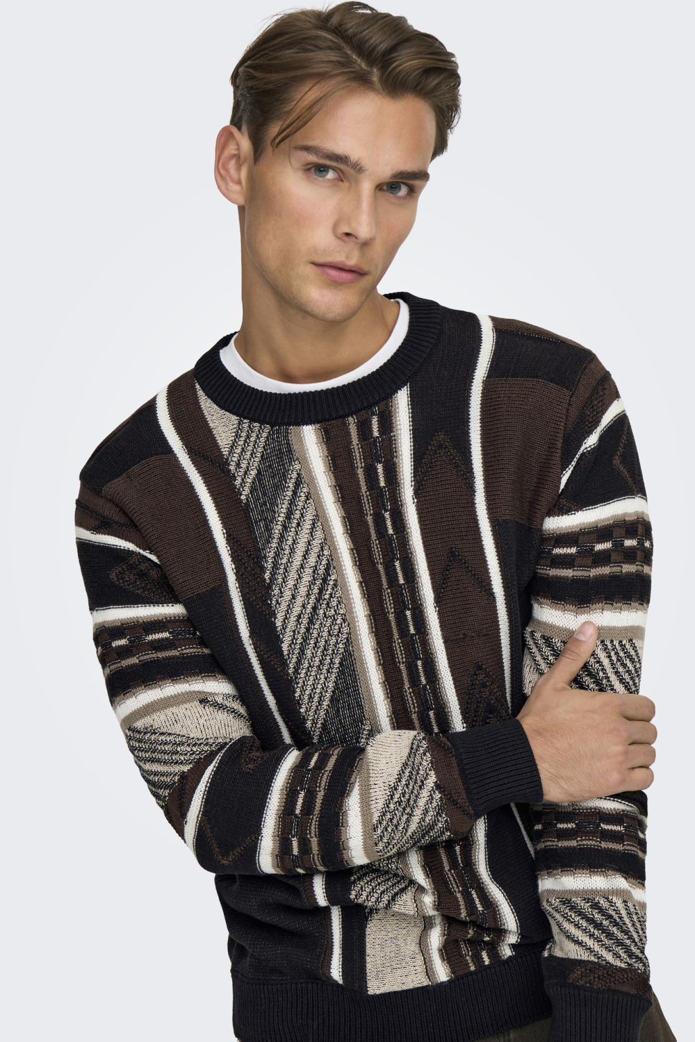 Deze unieke trui van Only & Sons is een stijlvolle keuze voor de wintermaanden. Gemaakt van een hoogwaardige mix van 60% katoen en 40% acryl, biedt deze trui zowel comfort als warmte. De opvallende zwart met bruine patronen zorgen voor een eigentijdse look, terwijl de regular fit pasvorm je een ontspannen gevoel geeft. Met een klassieke ronde hals wordt het geheel compleet. Dit patroon met zijn mix van lijnen en geometrische figuren geeft je outfit net dat beetje extra flair.