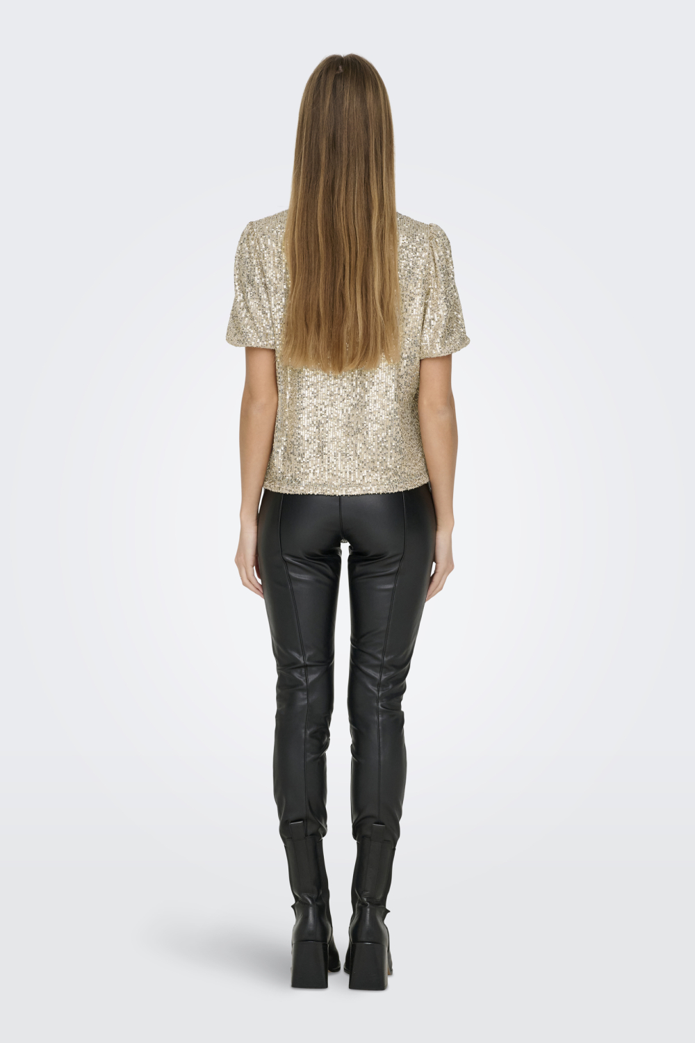 Dit elegante T-shirt van Only straalt met zijn opvallende pailletten. De gouden kleur en ronde halslijn zorgen voor een moderne touch, perfect voor een stijlvolle party uitstraling. Gemaakt van 100% polyester, zorgt dit dames T-shirt voor een comfortabel draagcomfort met zijn regular fit. De korte mouwen geven het geheel een speelse, maar chique look die geschikt is voor winterse feesten en evenementen.
