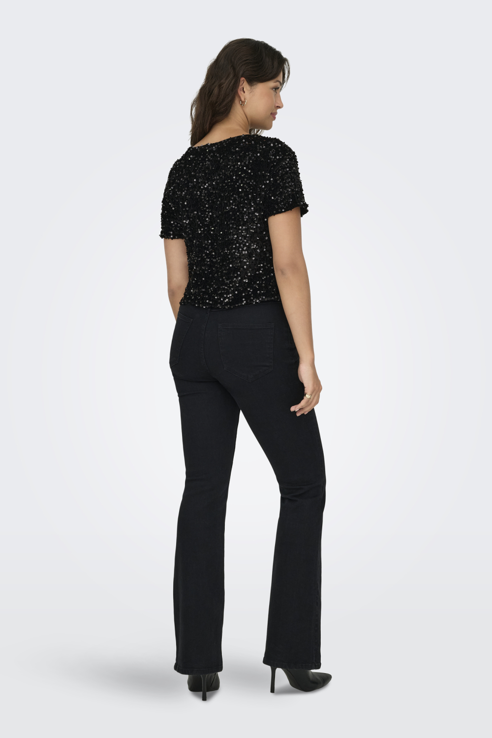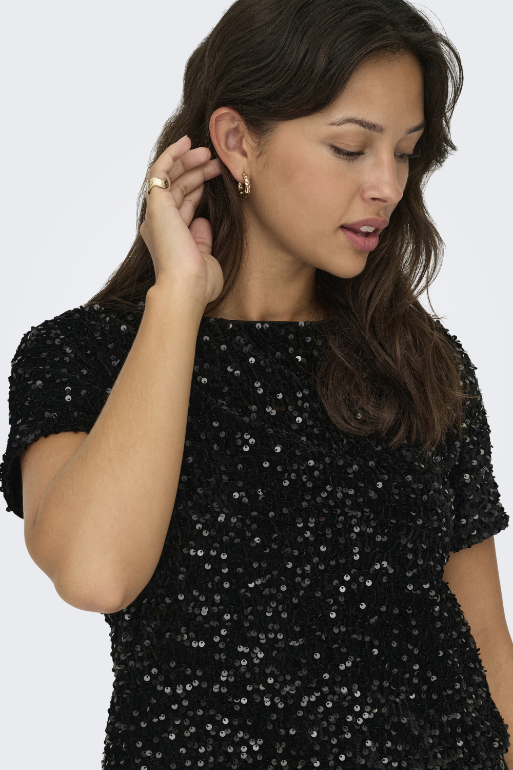 Dit elegante zwarte T-shirt van Only is een onweerstaanbare keuze voor je feestelijke garderobe. De prachtige pailletten zorgen voor een schitterend effect, perfect voor een avondje uit of een speciale gelegenheid. Met een boothals ontwerp en korte mouwen straalt dit T-shirt eenvoud en stijl uit. Gemaakt van 100% polyester, voelt het materiaal soepel aan op je huid en biedt het een comfortabele draagervaring. De normale lengte en de regular pasvorm maken dit stijlvolle T-shirt veelzijdig en makkelijk te combineren met diverse outfits. Draag het met een strakke jeans of een elegante rok om je look compleet te maken. Dit T-shirt is een geweldige match voor winterse feestjes of gezellige bijeenkomsten met vrienden. Voeg een vleugje glans toe aan je outfit en voel je zelfverzekerd in dit schitterende ontwerp van Only.