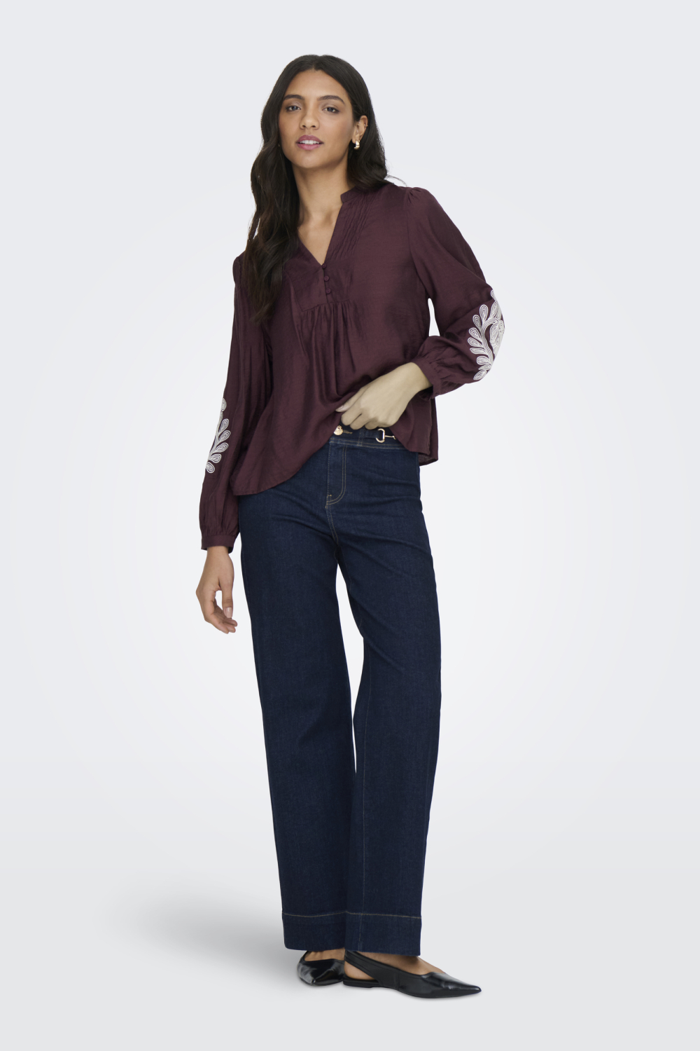 Dit casual T-shirt van Only, in de verfijnde kleur Winetasting, is een ideale aanvulling voor je wintergarderobe. Het is gemaakt van een comfortabele blend van 80% viscose en 20% polyester, waardoor het zacht aanvoelt op je huid. De structuur van de stof geeft het shirt een unieke uitstraling, terwijl het reguliere pasvorm zorgt voor een ontspannen look. Het T-shirt is voorzien van een V-hals en subtiele knoopjes aan de voorkant, wat het geheel een verfijnde touch geeft. De lange mouwen zijn verfraaid met gedetailleerd borduurwerk, dat het casual ontwerp een elegante twist geeft. Met zijn normale lengte is het T-shirt eenvoudig te combineren met een spijkerbroek voor een dagelijkse outfit of met een nette broek voor een wat formelere gelegenheid. Of je nu een dagje naar kantoor gaat of vrienden ontmoet voor een kop koffie, dit T-shirt van Only is zonder moeite te stylen voor elke situatie.