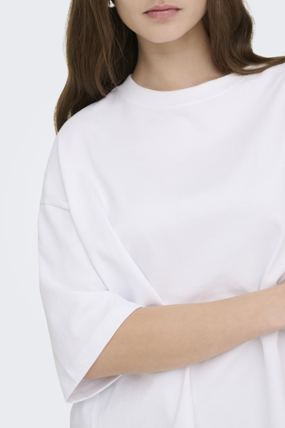 Dit casual witte T-shirt van Only brengt een ontspannen uitstraling naar je garderobe. De oversized pasvorm zorgt voor een moderne twist, terwijl de ronde hals comfortabel aanvoelt en de look compleet maakt. Gemaakt van 100% katoen, biedt dit T-shirt de hele dag door comfort en ademend vermogen. Het is een basisstuk dat gemakkelijk te combineren is met andere items voor verschillende gelegenheden. De korte mouwen en normale lengte maken dit T-shirt ideaal voor zowel warmere dagen als laagjes in koelere seizoenen. Combineer het met een jeans voor een casual look of draag het met een rok voor een iets elegantere stijl. Of je nu een dagje uit plant of een relaxte middag thuis, dit T-shirt past altijd. Dankzij het tijdloze design en kwalitatieve materiaal blijft het een favoriet in je kledingkast.