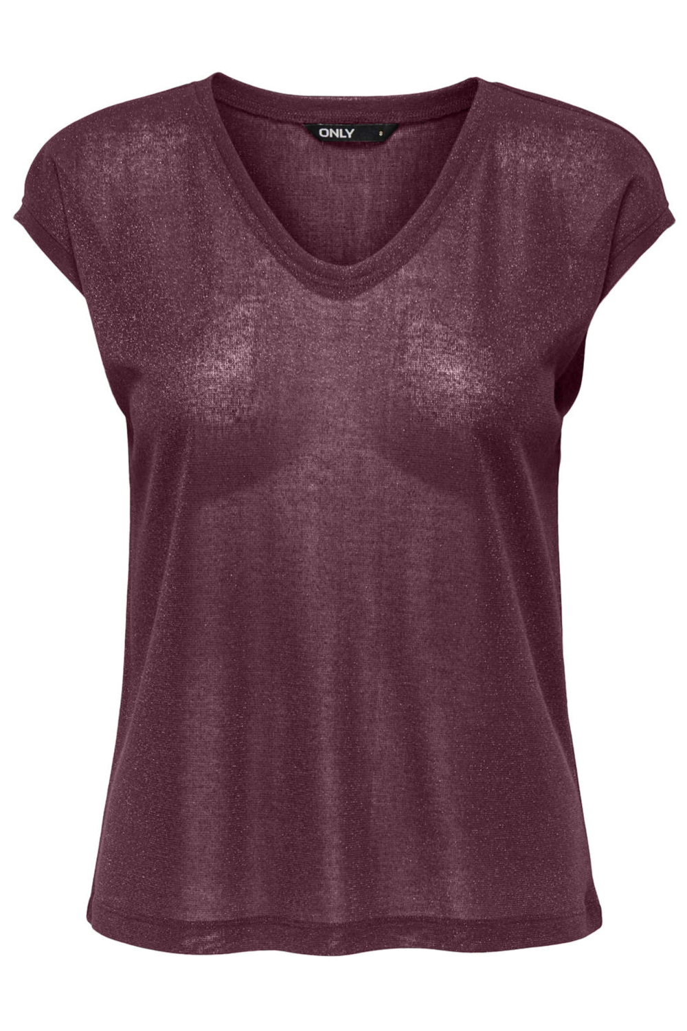 Met dit Only T-shirt voeg je een sprankelende touch toe aan je dagelijkse outfit. De bordeauxrode kleur en subtiele glitters maken dit shirt tot een veelzijdige keuze voor elke casual gelegenheid. De V-hals en kapmouwen geven het shirt een lichte en luchtige uitstraling, terwijl de regular fit zorgt voor een comfortabele pasvorm die bij iedereen goed staat. Gemaakt van een blend van polyester, viscose, en metaalgaren, biedt het niet alleen een zachte textuur, maar ook een luxe glans. Dit T-shirt is perfect voor wie een beetje extra flair wil toevoegen aan een eenvoudige look. Combineer het met een jeans voor een relaxte dag in de stad of draag het met een zwierige rok voor een etentje met vrienden. Door het tijdloze ontwerp en de normale lengte is dit item makkelijk te integreren in elke garderobe en geschikt voor elk seizoen. Voeg wat elegantie toe aan je dagelijkse outfits met dit stijlvolle T-shirt van Only.