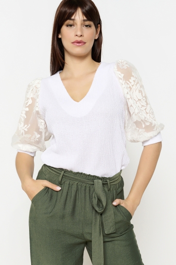 Gestructureerd T-shirt van Only. Dit model heeft kapmouwen en een ronde hals met een rits in de nek.