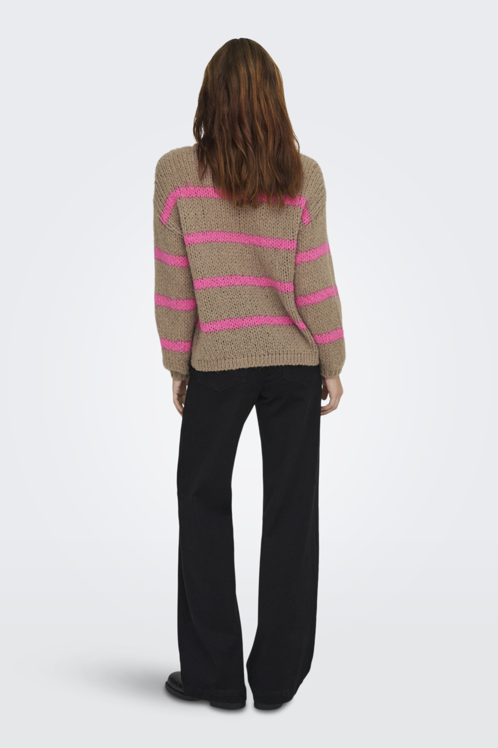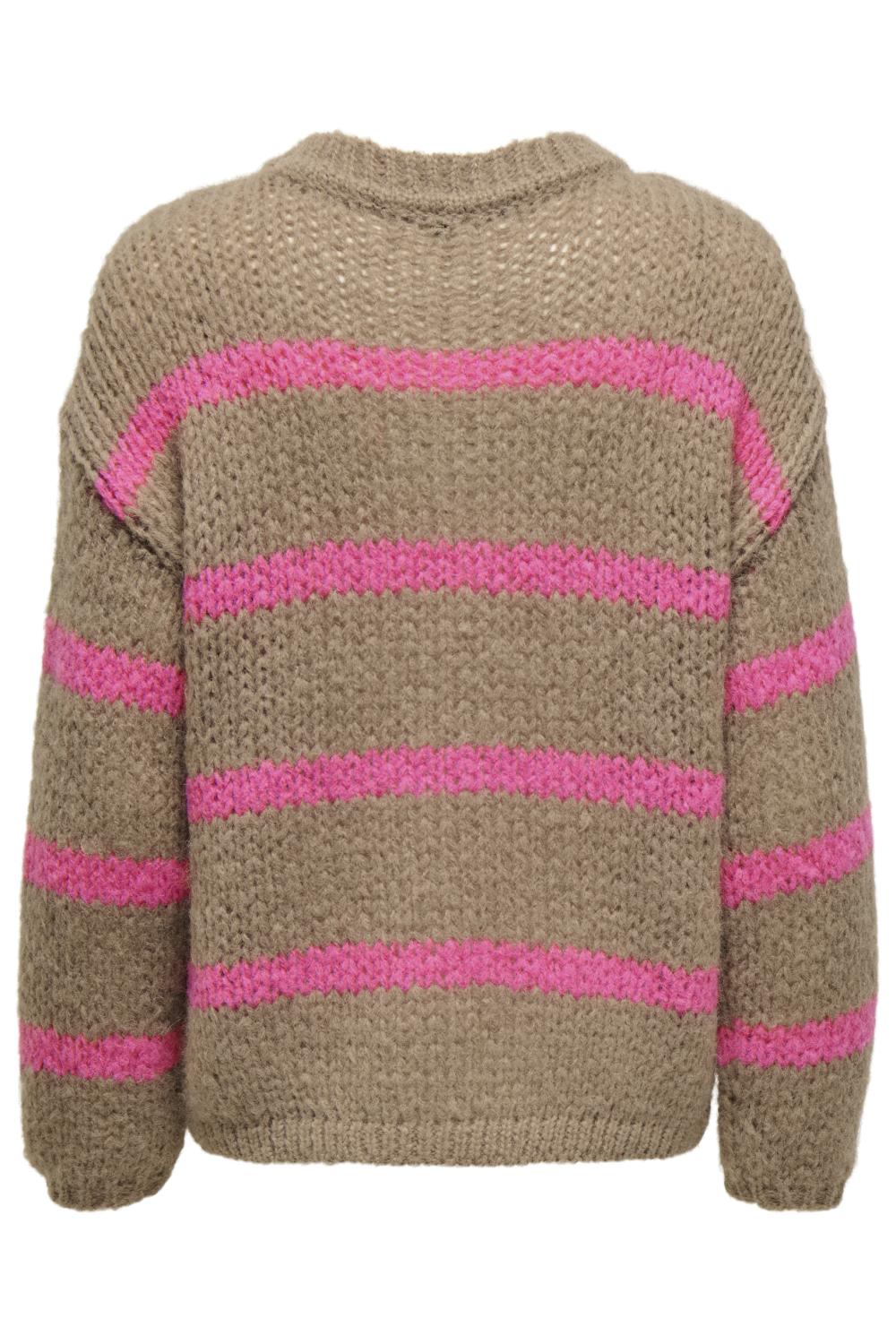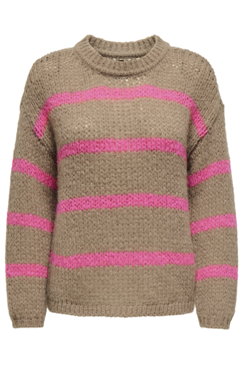 Deze stijlvolle trui van Only is de perfecte aanvulling voor je wintergarderobe. De trui heeft een regular fit en is gemaakt van 57% gerecycled polyester en 43% polyester, waardoor hij niet alleen comfortabel, maar ook duurzaam is. De opvallende streeppatronen in roze en bruin geven een speelse twist aan je outfit. De ronde hals en lange mouwen zorgen voor een klassieke look, terwijl de normale lengte veel draagcomfort biedt.