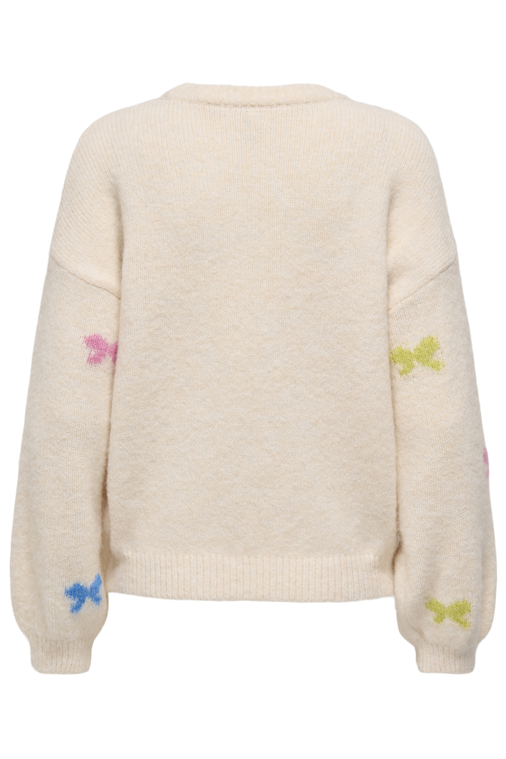 Deze Only damestrui is een charmante toevoeging aan je wintercollectie. Met een speels grafisch patroon van kleurrijke strikjes geeft deze trui een vrolijke twist aan je outfit. De trui heeft een regular pasvorm en een ronde hals, waardoor hij comfortabel valt en gemakkelijk te combineren is met verschillende stijlen. De lange mouwen en normale lengte zorgen voor extra warmte tijdens koude dagen. De zachte knitwear stof van deze Only trui maakt hem ideaal voor dagelijks gebruik, of je nu naar je werk gaat of een ontspannen weekend plannen hebt. De subtiele beige basiskleur zorgt ervoor dat de felle strikjes extra opvallen, wat dit kledingstuk een speelse en unieke uitstraling geeft. Combineer deze trui met een donkere jeans of een nette rok voor een casual en stijlvolle look die in elke situatie goed van pas komt.