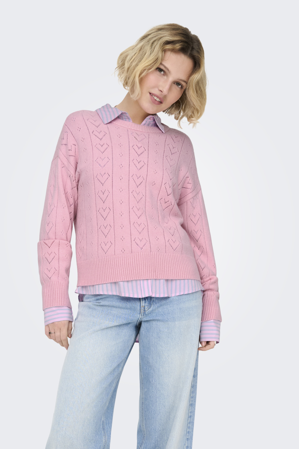 Deze roze trui van Only is een stijlvolle toevoeging aan je lentegarderobe. Met zijn verfijnde ajourpatroon trekt de trui subtiele aandacht en biedt het een moderne, vrouwelijke uitstraling. De regular fit pasvorm en de ronde hals zorgen voor een comfortabele en casual look, terwijl de lange mouwen extra warmte bieden op frisse dagen. De trui, gemaakt van een hoogwaardige mix van viscose, nylon en polyester, voelt zacht aan op de huid en behoudt zijn vorm. Met zijn normale lengte is deze Only trui makkelijk te combineren met diverse stijlen, of je nu kiest voor een relaxte jeans of een elegante rok. Ideaal voor een informele werkbijeenkomst, een ontspannen lunch met vrienden of een leuke dag in de stad. De zachte pastelkleur maakt het een veelzijdige optie die je gemakkelijk kunt matchen met verschillende kleuren en accessoires in je garderobe. Voeg een speelse en verfijnde touch toe aan je outfit met deze veelzijdige knitwear essential.
