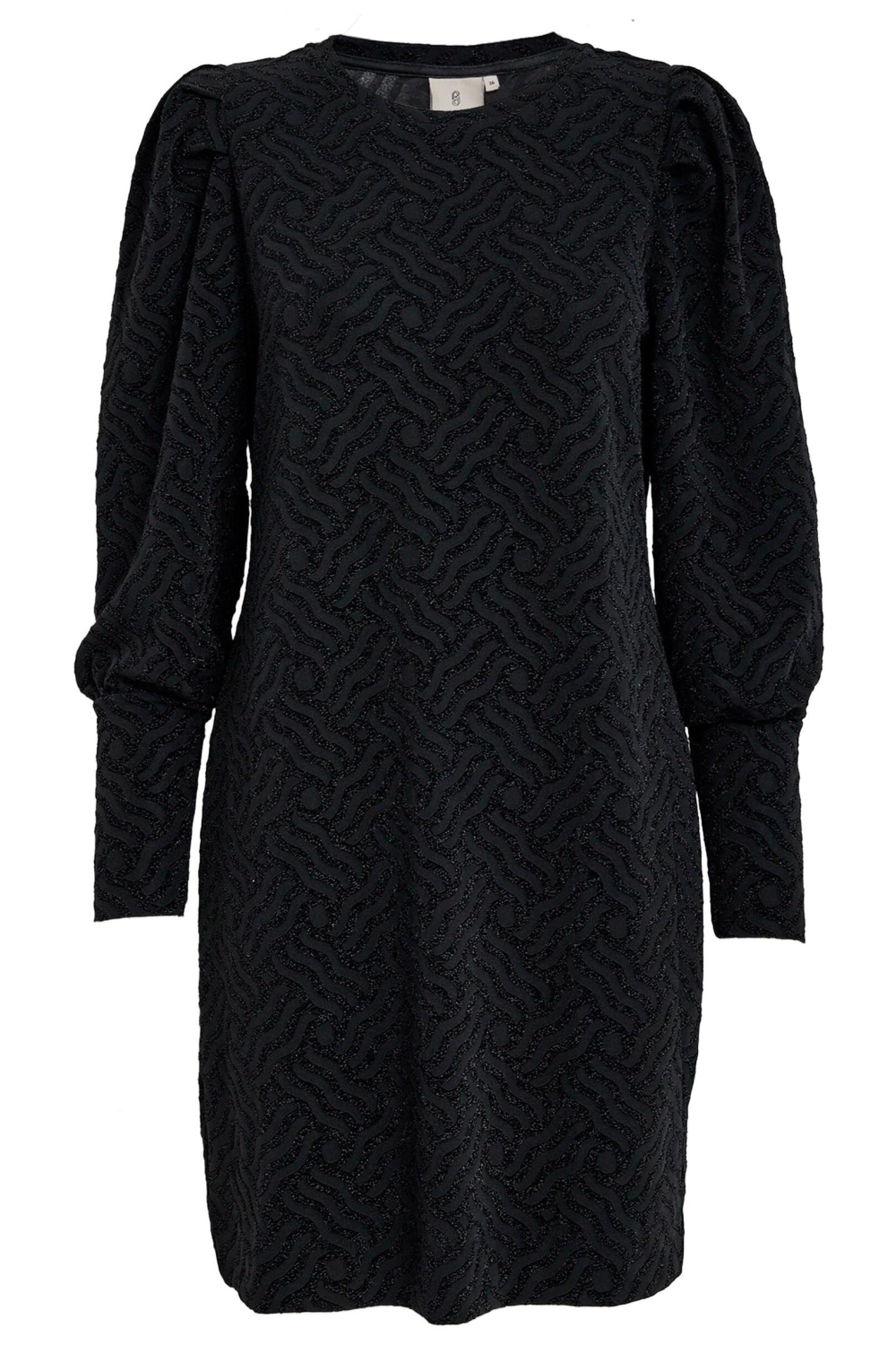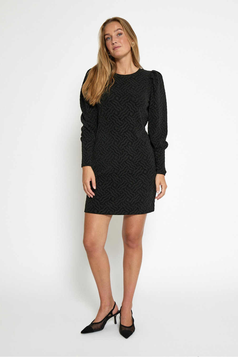 Deze chique zwarte jurk van Peppercorn voegt een verfijnde touch toe aan je wintergarderobe. De elegante glitters in het zwarte jacquard patroon laten de jurk stralen, ideaal voor zowel feestelijke als formele gelegenheden. Met een regular pasvorm en een ronde hals biedt deze jurk een comfortabele, maar stijlvolle uitstraling. De lange mouwen en korte lengte maken het een perfecte keuze voor de koudere maanden zonder in te boeten op stijl. De jurk valt soepel en past bij verschillende gelegenheden, van een avondje uit tot een stijlvolle bijeenkomst. Combineer met een paar elegante hakken om je look compleet te maken. Het ontbreken van een voering zorgt voor een lichte draagervaring, terwijl de zorgvuldig ontworpen details van de stof elke outfit naar een hoger niveau tillen. Met zijn veelzijdige ontwerp en klassieke uitstraling is deze jurk van Peppercorn geschikt voor elke modebewuste vrouw die op zoek is naar iets bijzonders. Meer informatie: De totale lengte is 85 cm bij maat S.