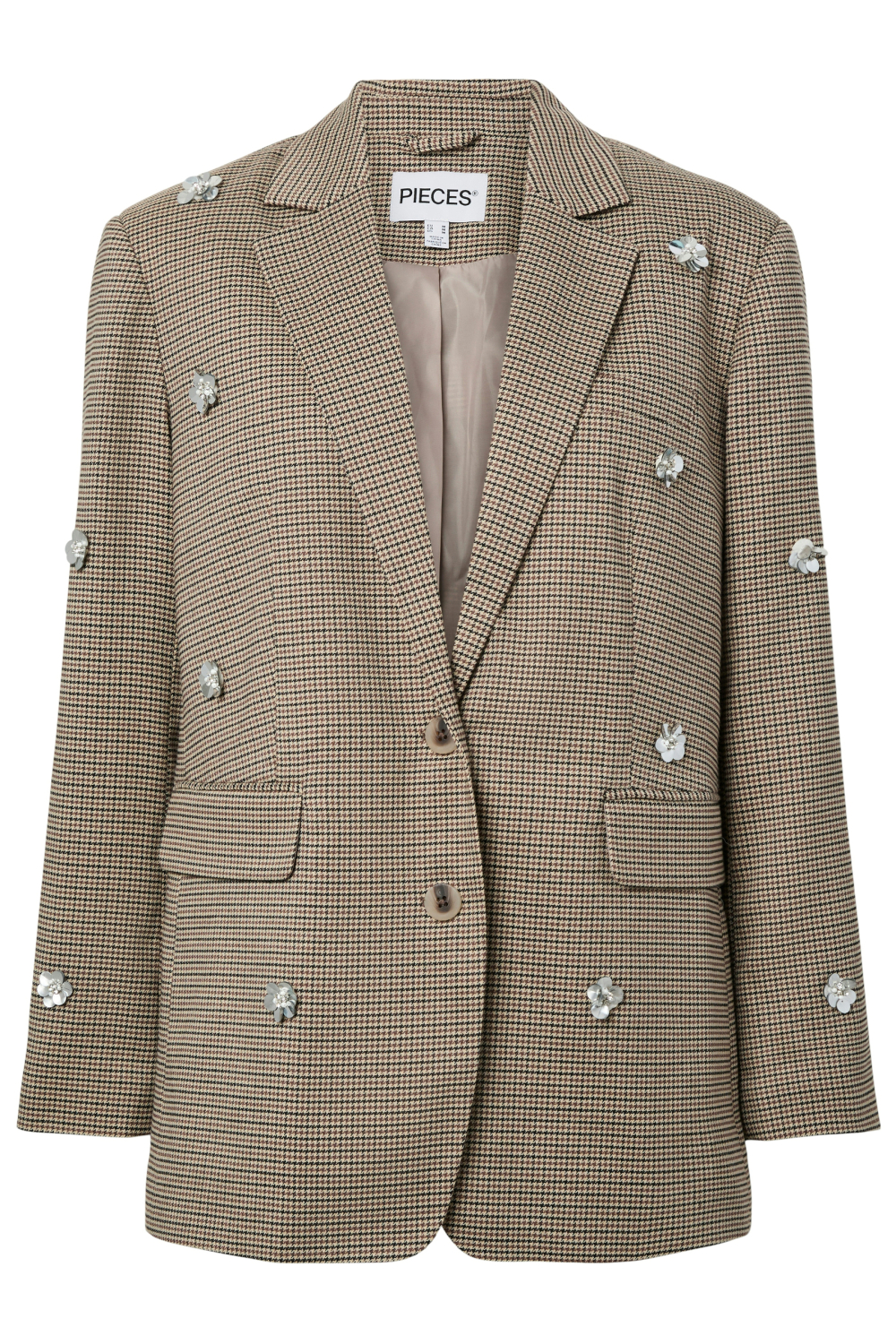 Deze elegante Pieces blazer is een stijlvolle toevoeging aan jouw wintergarderobe. Gemaakt van een comfortabele mix van 98% polyester en 2% elastan, biedt deze damesblazer een prettige pasvorm die je goed staat bij allerlei gelegenheden. Het halflange model in een regular fit geeft een moderne uitstraling, terwijl de knoopsluiting en reverskraag zorgen voor een klassieke touch. De delicate pailletten verspreid over het klassieke pied-de-poule patroon geven deze blazer net dat beetje extra flair. Of je deze Pieces blazer nu combineert met een nette broek voor een zakelijke afspraak of juist casual wilt dragen met een spijkerbroek voor een dagje in de stad, hij past altijd. De lange mouwen zorgen voor extra comfort tijdens de koudere maanden, terwijl de neutrale tinten het combineren met andere kledingstukken gemakkelijk maken. Voeg dit veelzijdige kledingstuk toe aan je collectie en creëer moeiteloos een chique look voor elke gelegenheid.