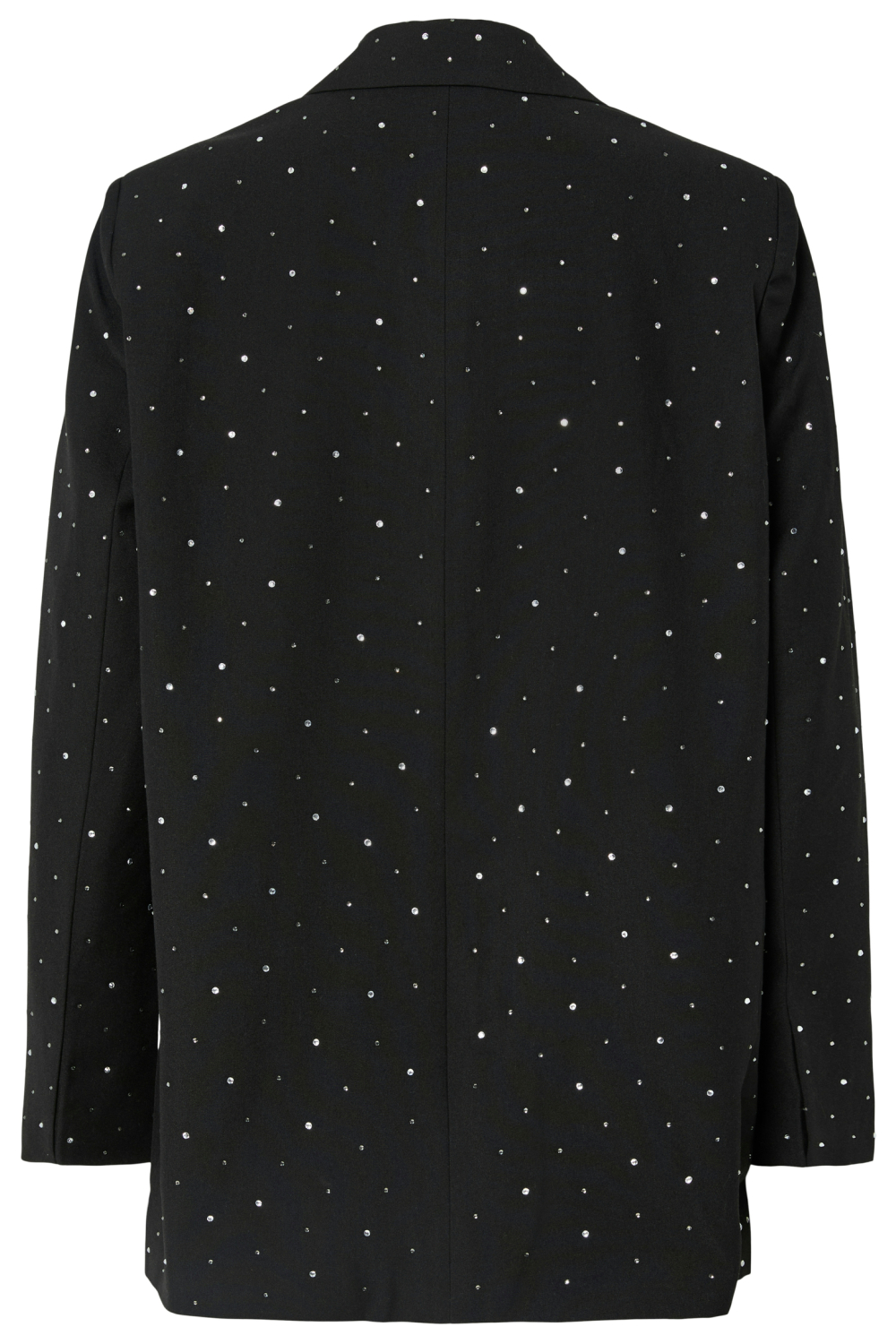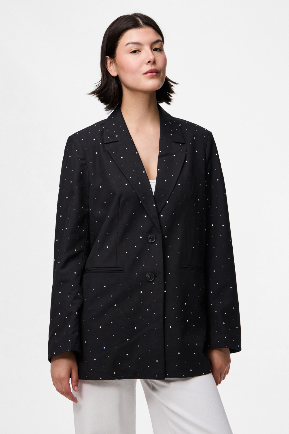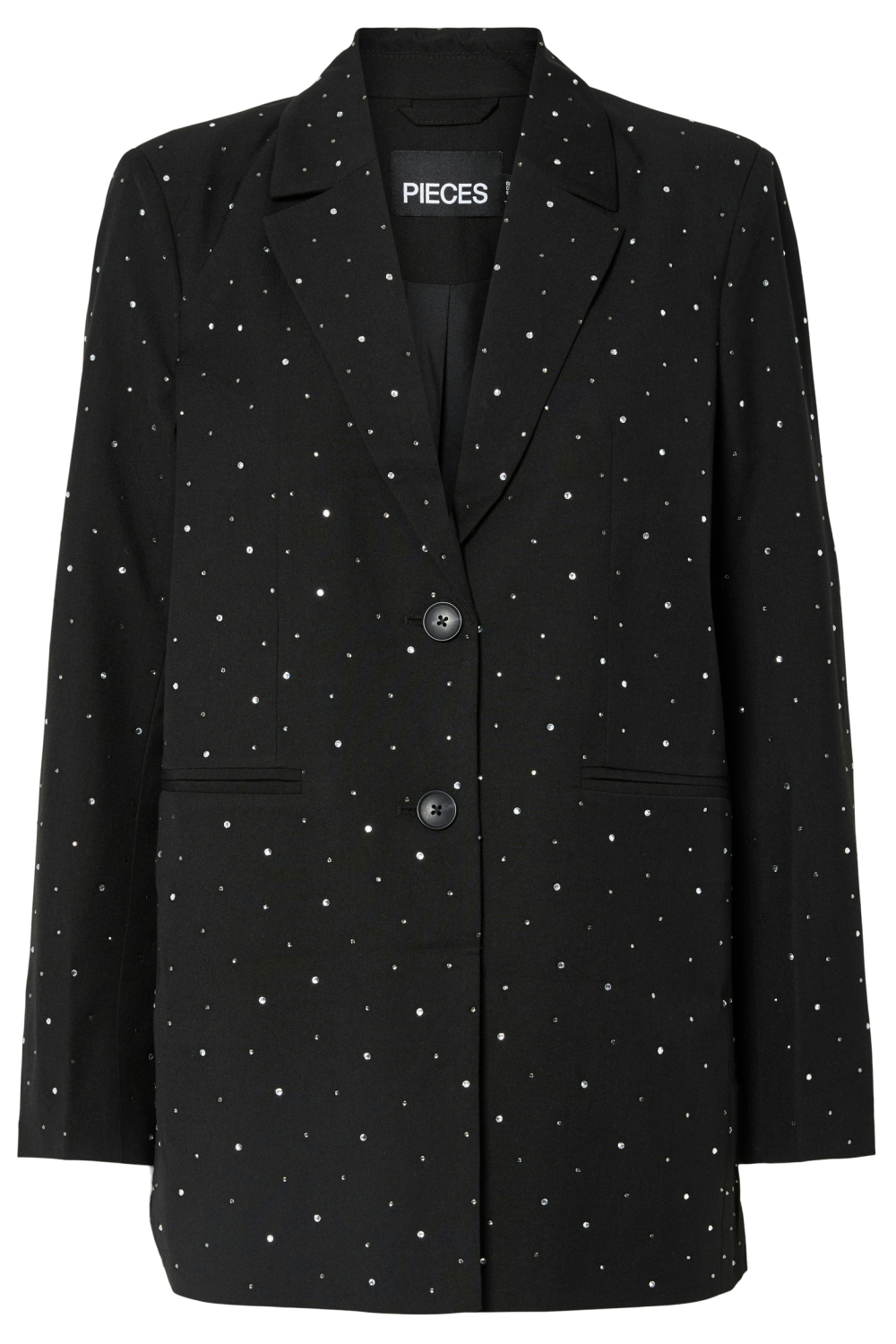 Deze elegante zwarte blazer van Pieces is een stijlvolle blikvanger voor je herfstgarderobe. Het patroon van subtiele strasssteentjes over de hele blazer geeft een verfijnde glans, waardoor je look net dat beetje extra krijgt. De regular fit zorgt ervoor dat je comfortabel en zelfverzekerd voor de dag komt, ongeacht de gelegenheid. Met lange mouwen en een klassiek reverskraagontwerp, straalt deze blazer een tijdloze elegantie uit die perfect is voor zowel casual als formelere settings.