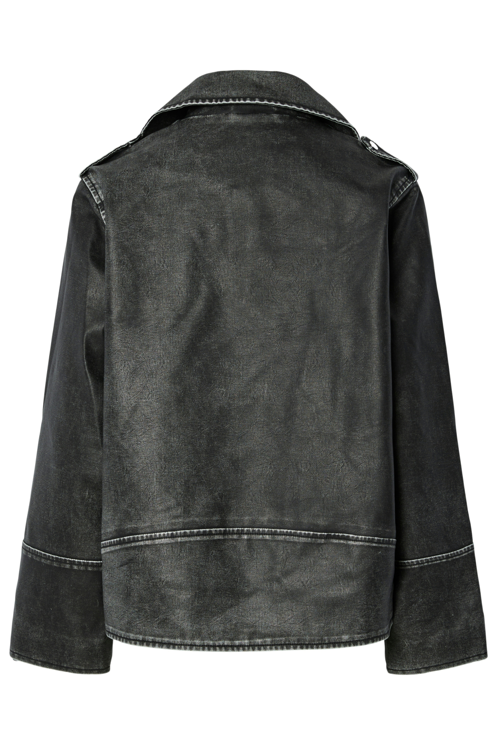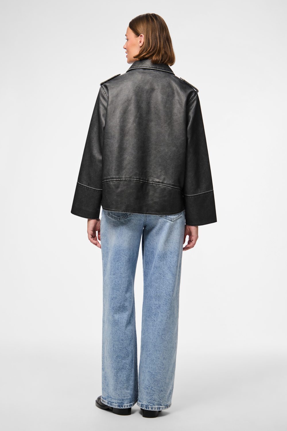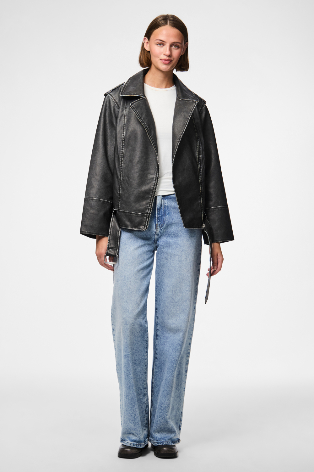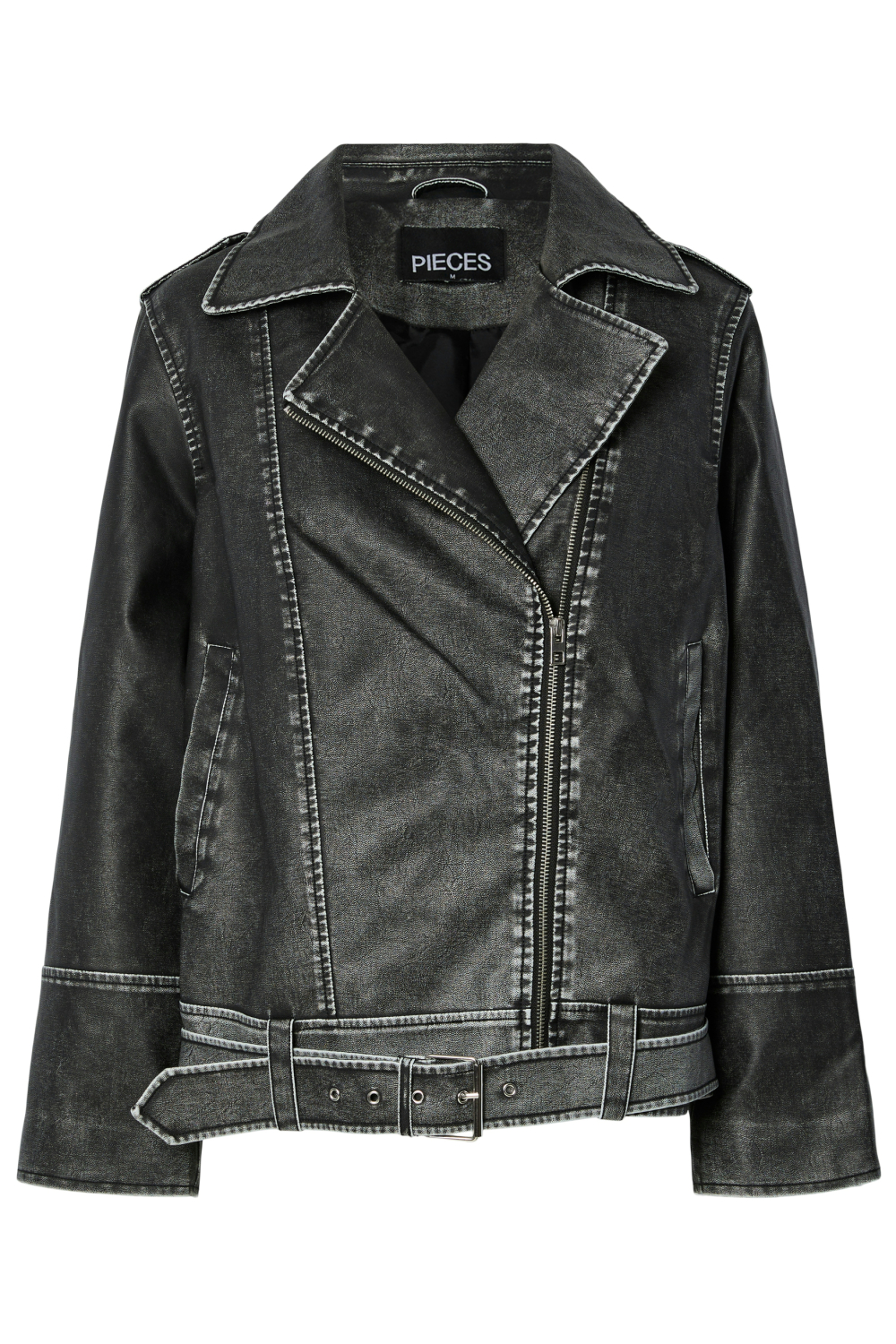 Deze zwarte Pieces jas biedt een stoere uitstraling dankzij het imitatieleer en de opvallende revers kraag. De rits aan de voorkant zorgt voor een praktische en moderne look, terwijl de lange mouwen en normale lengte zorgen voor voldoende dekking tijdens koele herfstdagen. Met handige steekzakken kun je gemakkelijk kleine benodigdheden opbergen. De jas heeft een regular fit, waardoor hij comfortabel zit voor dagelijks gebruik.