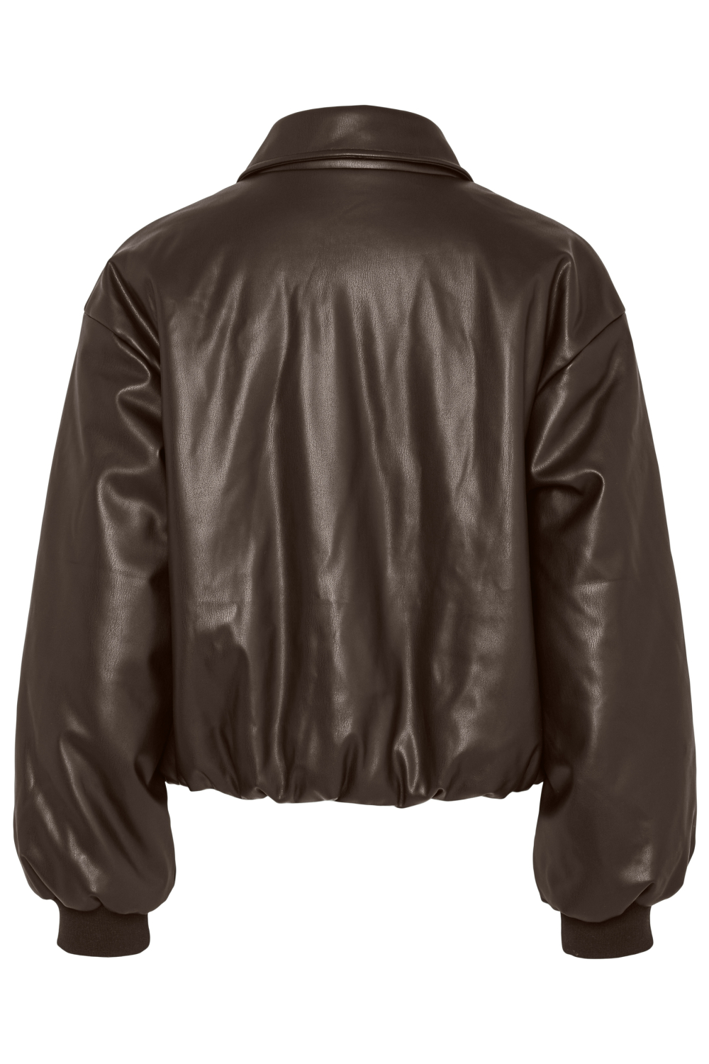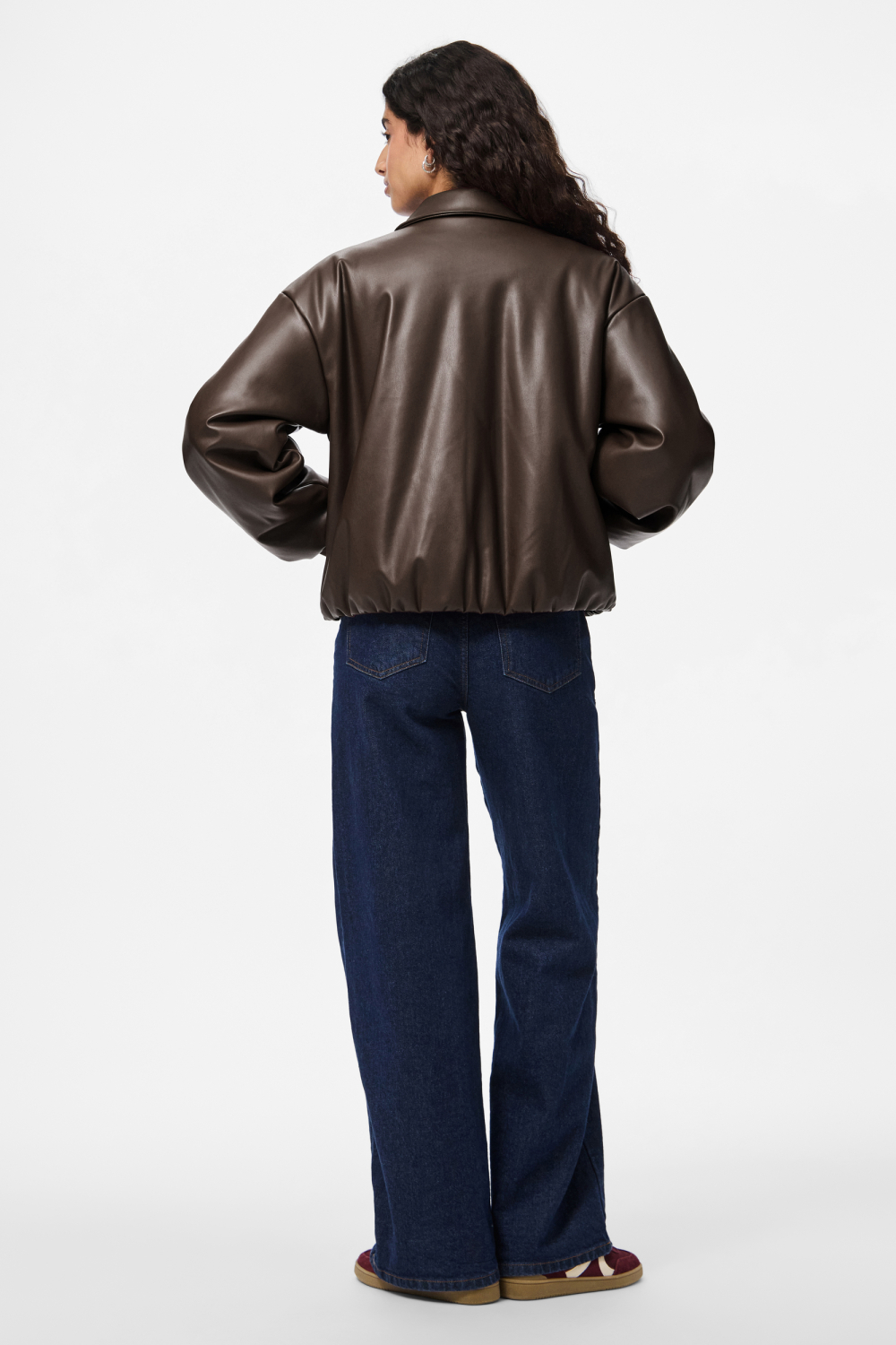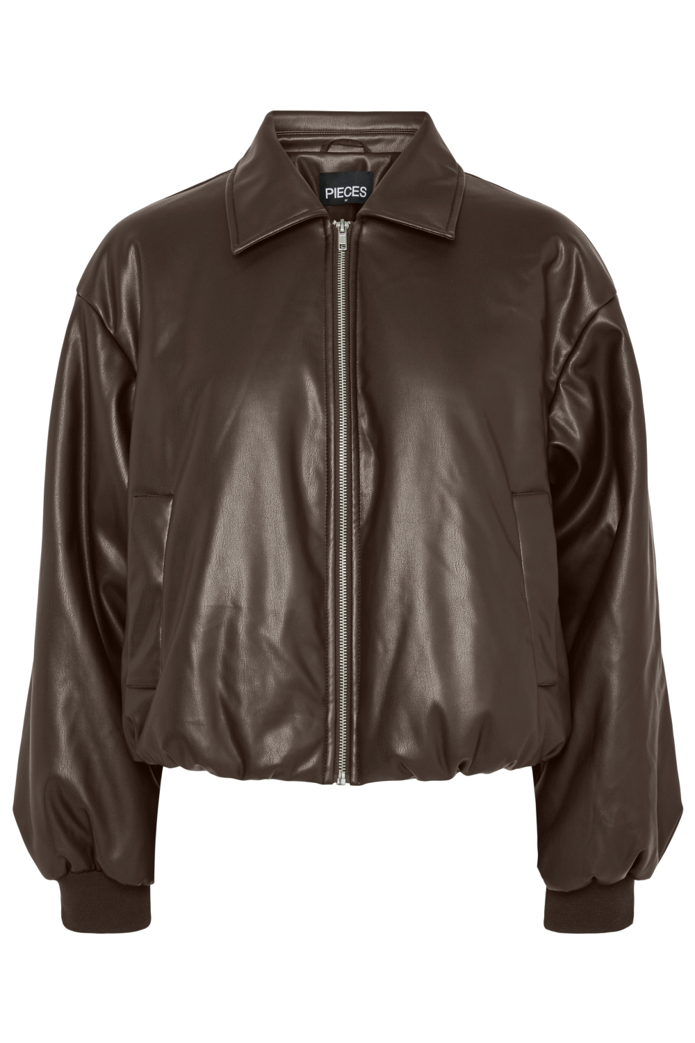 Met deze stijlvolle imitatie leren jas van Pieces voeg jij een elegante touch toe aan je winter garderobe. Dit kort gesneden model heeft een casual uitstraling en een regular fit, waardoor het zowel comfortabel als modieus is. De jas heeft een diepe kleur die onder de naam "Hot Fudge" valt en zorgt voor een warme en luxueuze look. De puntkraag en de ritssluiting geven deze jas een moderne uitstraling, terwijl de subtiele steekzakken het geheel praktisch maken.