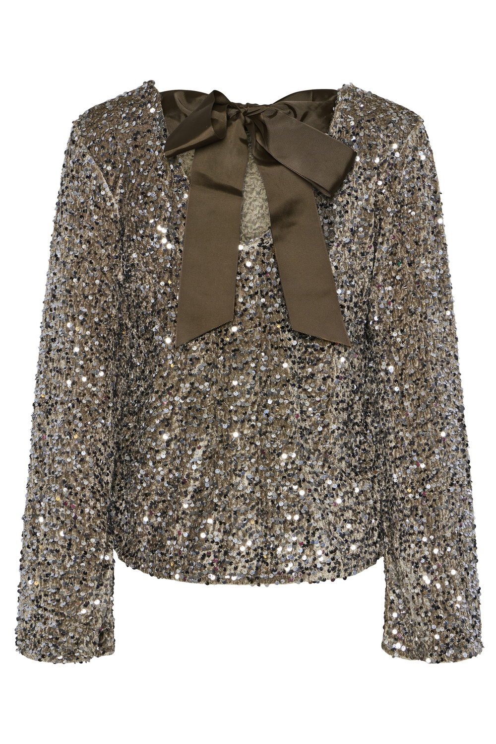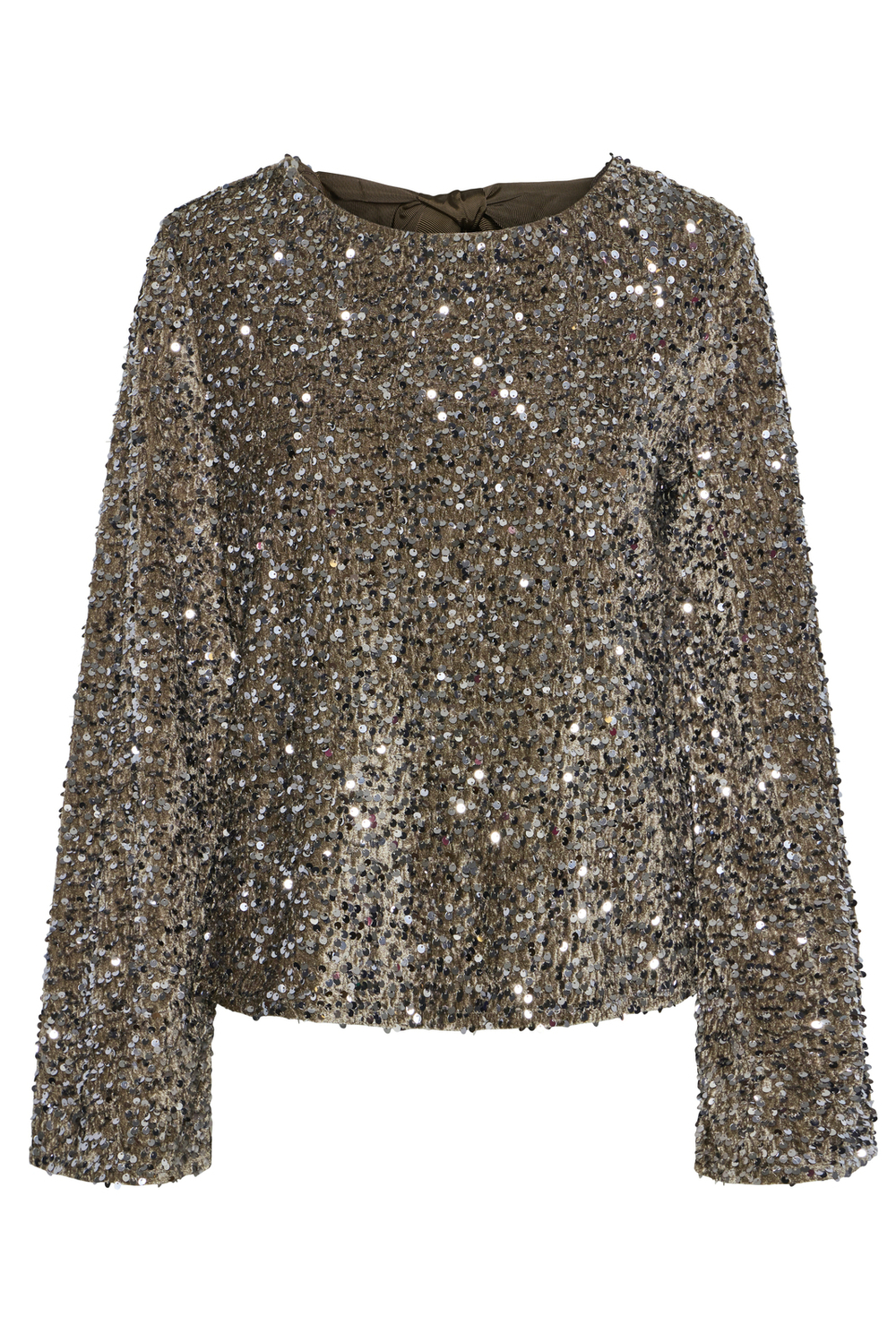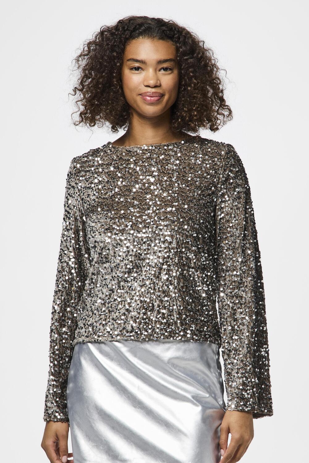 Feestelijk T-shirt van Pieces met een strik op de rug. Dit model heeft een ronde hals en lange mouwen. Het T-shirt heeft zilverkleurige pailletten.