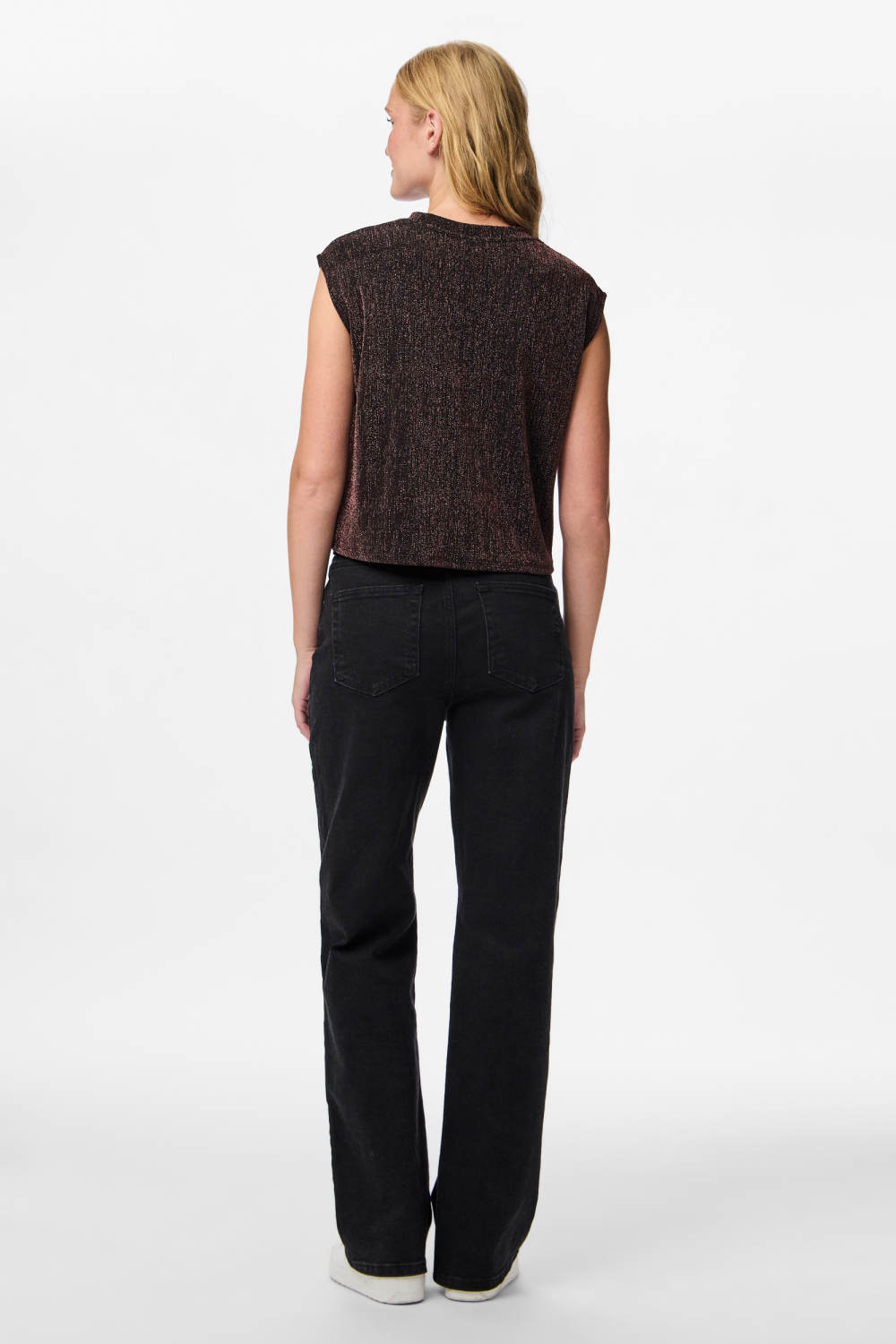 Met zijn speelse glinstering kun je deze top moeiteloos combineren voor een feestje of een gezellig diner. De normale lengte maakt het eenvoudig te dragen met zowel een hoge taille broek als een elegante rok. Door de subtiele maar luxe uitstraling is deze Pieces top een veelzijdige aanvulling op je garderobe. Of je nu een avondje uit gaat met vrienden of een speciale gelegenheid hebt, deze top biedt de perfecte balans tussen casual en chic.