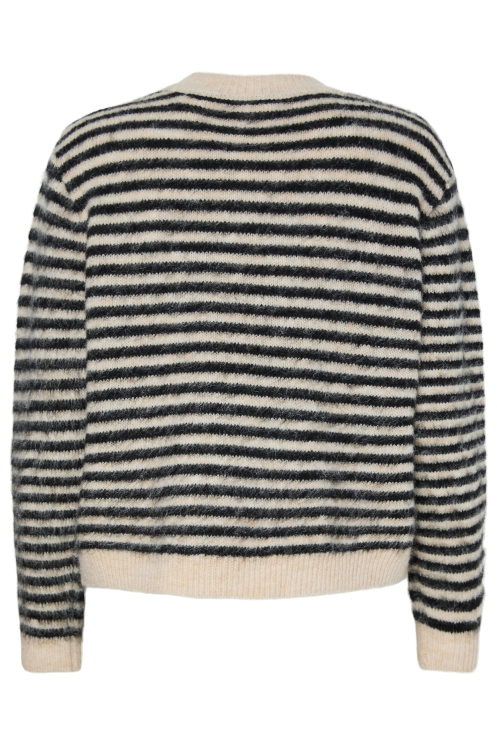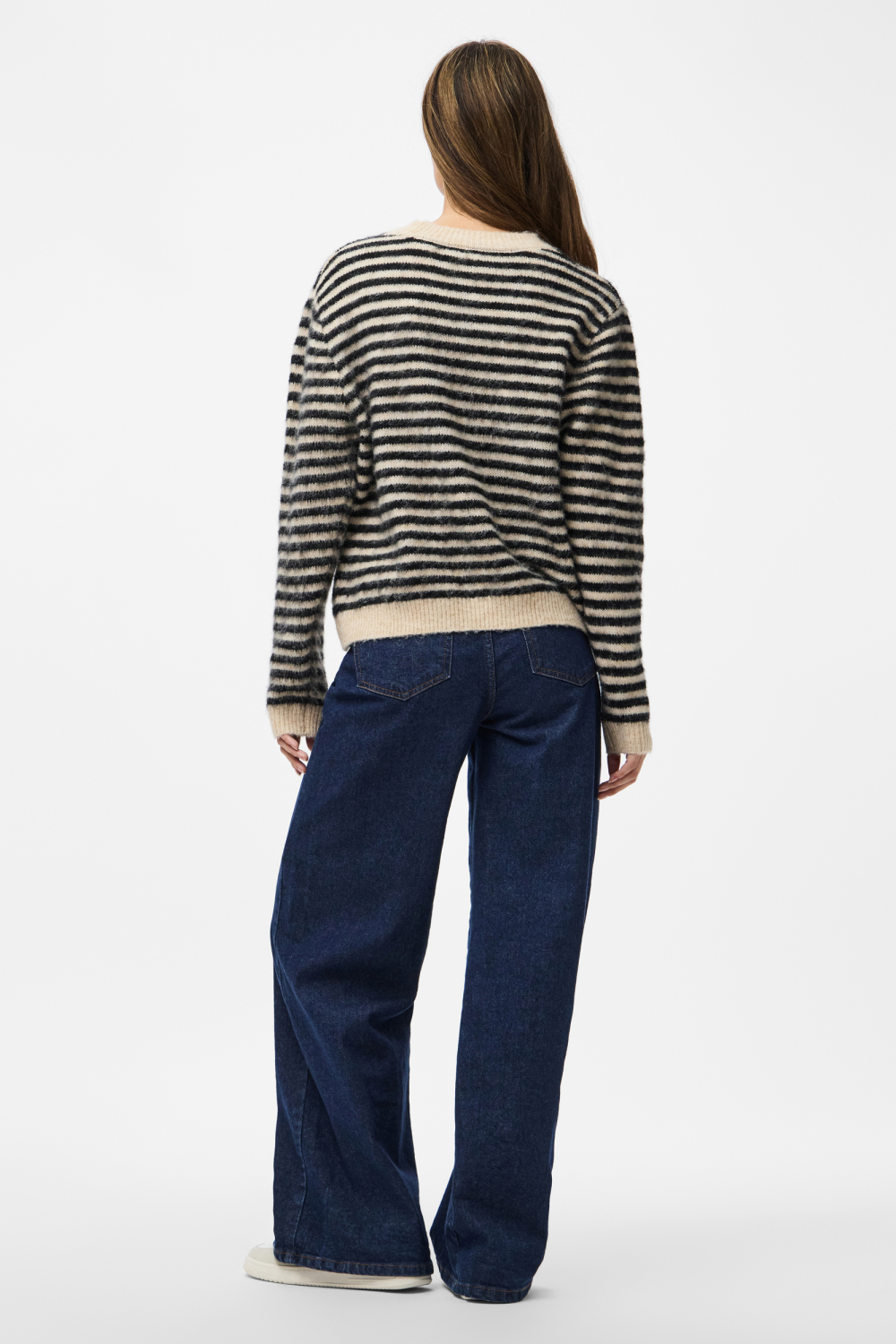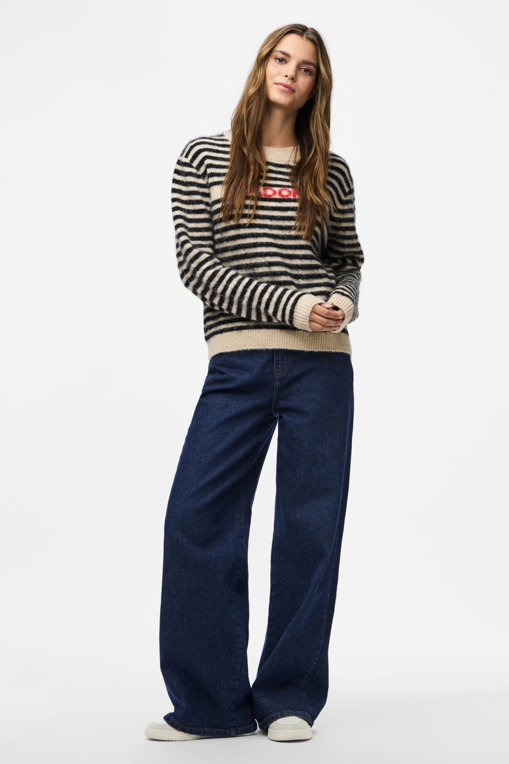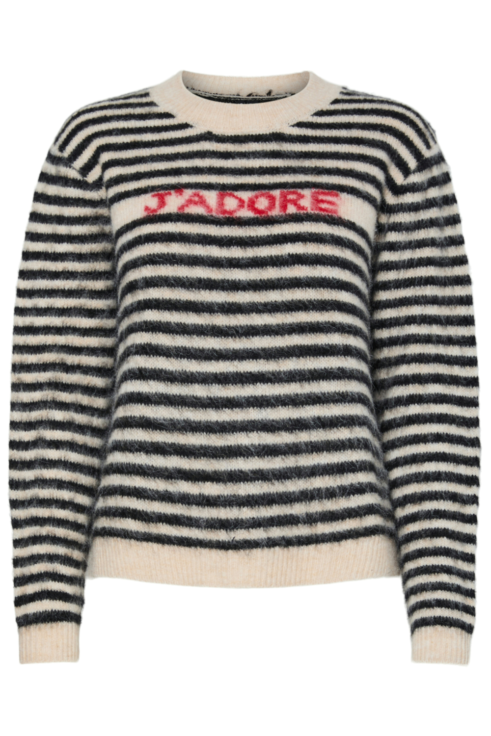 Deze trendy gestreepte trui van Pieces is een veelzijdige aanvulling op je wintergarderobe. Met een regular fit en een comfortabele, ronde hals biedt deze trui zowel stijlvol comfort als warmte op koude dagen. De klassiek zwarte en beige strepen worden onderbroken door een speelse rode "J'ADORE" print, wat een speelse touch toevoegt aan je look. De trui komt het best tot zijn recht in casual settings, maar is ook elegant genoeg voor een informele meeting of een gezellige avond met vrienden.