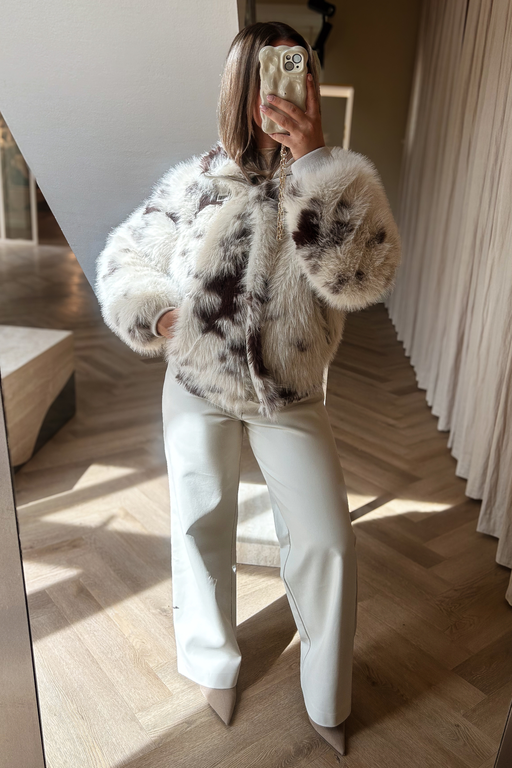 Deze damesjas van Rino & Pelle uit de wintercollectie is een stijlvolle aanvulling op je garderobe. De jas is gemaakt van 100% polyester en heeft een opvallend imitatiebontpatroon in een mix van lichte en donkere tinten. Met een high neck en een combinatie van knoop- en ritssluiting biedt de jas zowel comfort als bescherming tegen koude wind. De lange mouwen en de korte lengte maken het tot een veelzijdig stuk dat makkelijk te combineren is met diverse outfits. De ritszakken zijn zowel praktisch als stijlvol, perfect voor een casual dagje uit of een middag shoppen. Dankzij het zachte materiaal en de regular fit pasvorm zit deze Rino & Pelle jas als gegoten. De jas is ideaal voor koudere dagen en biedt een modieuze uitstraling die zowel in een stedelijke als informele setting past. De jas kan moeiteloos gecombineerd worden met een elegante broek of een alledaagse jeans. Of je nu een afspraak hebt in de stad of een ontspannen weekend plant, deze jas biedt de perfecte balans tussen stijl en comfort. Meer informatie: Totale lengte is 59 cm bij maat 36.