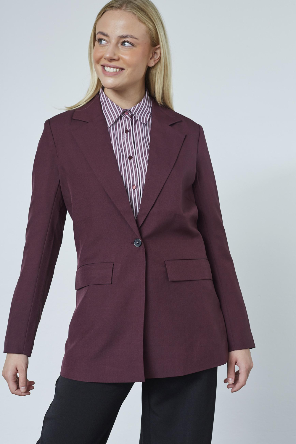Of je nou naar kantoor gaat of een ontspannen dagje uit plant, deze blazer is een betrouwbare keuze. De diepe bordeauxrode kleur geeft het geheel een warme uitstraling, ideaal voor de koude maanden. Combineer deze blazer met een stijlvolle blouse voor een professionele look of draag hem over een casual trui voor een meer relaxte vibe. De polyester voering zorgt voor extra draagcomfort, waardoor je de hele dag comfortabel blijft zonder in te boeten op stijl. Met deze blazer maak je in elke situatie een stijlvolle indruk.