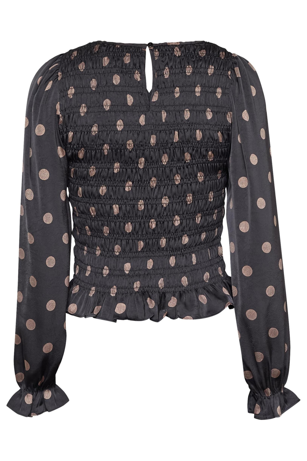 De SisterS point blouse met patroon in BLACK DOT is een verfijnde toevoeging aan je wintergarderobe. Gemaakt van 100% polyester, biedt deze blouse een comfortabele regular fit die geschikt is voor elke gelegenheid. De zwarte stof met speelse stippen zorgt voor een subtiele en stijlvolle uitstraling, en de smockdetails aan de voorkant geven het geheel een unieke twist. De blouse heeft een ronde hals en een knoopsluiting aan de achterkant, waardoor je moeiteloos een elegante outfit creëert. Deze blouse is ideaal voor casual settings, zoals een ontspannen dagje uit of een informele lunch met vrienden. De lange mouwen en normale lengte maken het perfect voor de koudere maanden. Combineer de blouse met een nette pantalon voor een chique uitstraling, of draag het met een favoriete jeans voor een relaxte look. Of je nu een koffie gaat drinken of een informele meeting hebt, met deze blouse maak je altijd een stijlvolle indruk.