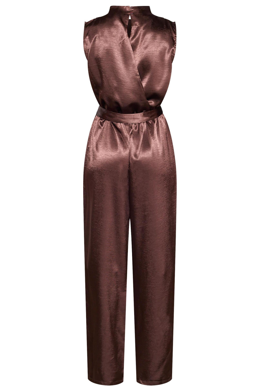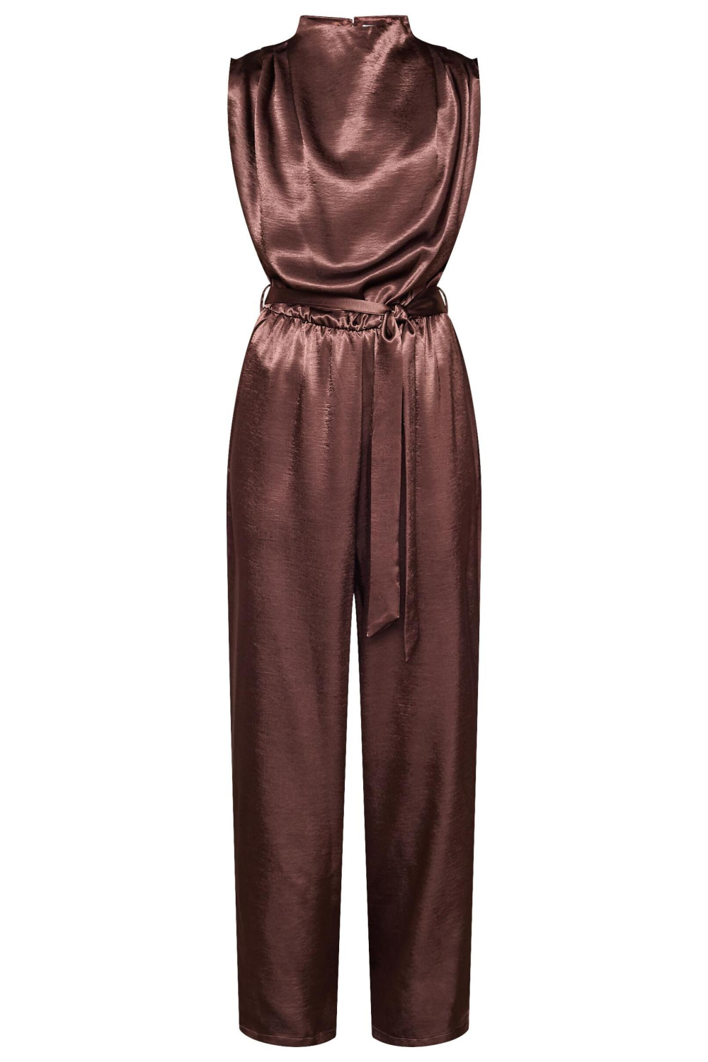 Met deze SisterS point jumpsuit in een elegante bruine kleur ben je klaar voor elk feestelijk moment. Het glanzende patroon van de stof geeft een chique uitstraling, perfect voor de winter. Gemaakt van 100% polyester, biedt de jumpsuit een comfortabele regular fit die moeiteloos met je meebeweegt. De hoge halslijn en mouwloze snit zorgen voor een moderne en verfijnde look. De knoopsluiting aan de achterkant voegt een subtiele detail toe en maakt het geheel eenvoudig aan te trekken. De jumpsuit heeft een normale lengte en valt prachtig langs je lichaam dankzij de vloeiende lijnen. Het subtiele ceintuurtje accentueert je taille, waardoor je een vrouwelijke silhouet creëert. Deze stijl is een match voor elke avond uit of een speciale gelegenheid waarin je wilt schitteren. Combineer de jumpsuit met hoge hakken en een minimalistische clutch voor een complete look. Of het nu een gala of een cocktailparty is, met dit kledingstuk maak je altijd een elegante indruk.