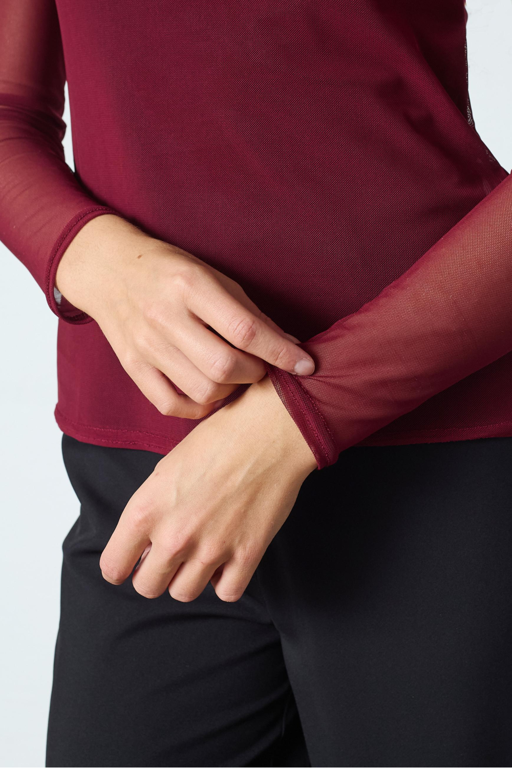 Dit bordeauxrode T-shirt van SisterS point is een stijlvolle aanvulling op je wintergarderobe. De combinatie van 95% polyester en 5% elastaan zorgt voor een comfortabele pasvorm en een lichte stretch. De semi-transparante lange mouwen geven het shirt een unieke en speelse uitstraling, terwijl de ronde hals bijdraagt aan de casual look. Met zijn normale lengte is het shirt ideaal te combineren met zowel jeans als rokken, waardoor je moeiteloos kunt variëren tussen verschillende stijlen. Of je nu een informele dag op kantoor hebt of een avondje uit plant, dit T-shirt past perfect bij veel verschillende gelegenheden. De zachte bordeauxrode kleur straalt warmte uit, ideaal voor de koudere winterdagen. Draag het met een mooi topje eronder voor extra comfort en stijl. De regular fit zorgt ervoor dat het shirt geschikt is voor veel lichaamsvormen. Een veelzijdig kledingstuk dat jouw winterse outfits een modieus tintje geeft.